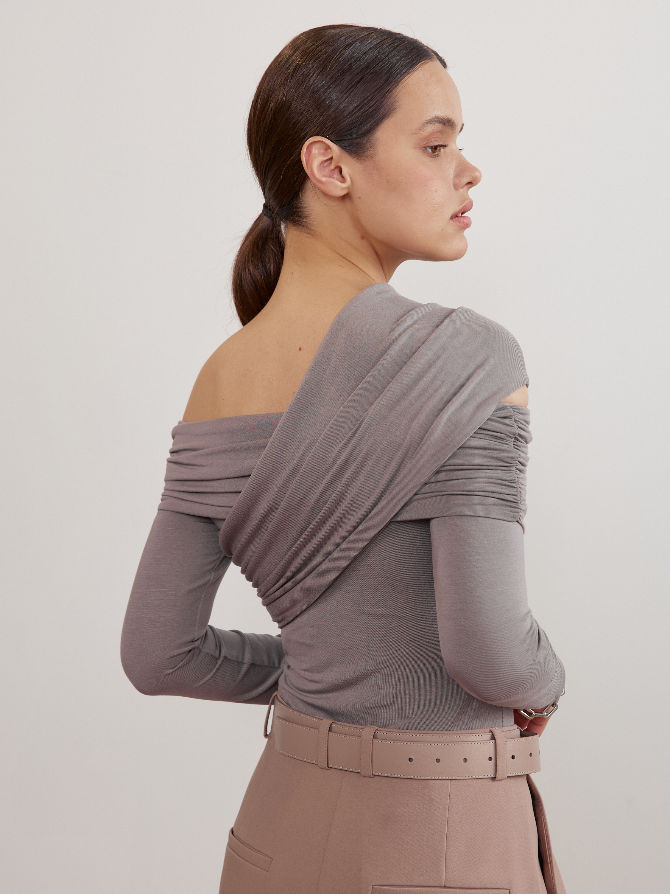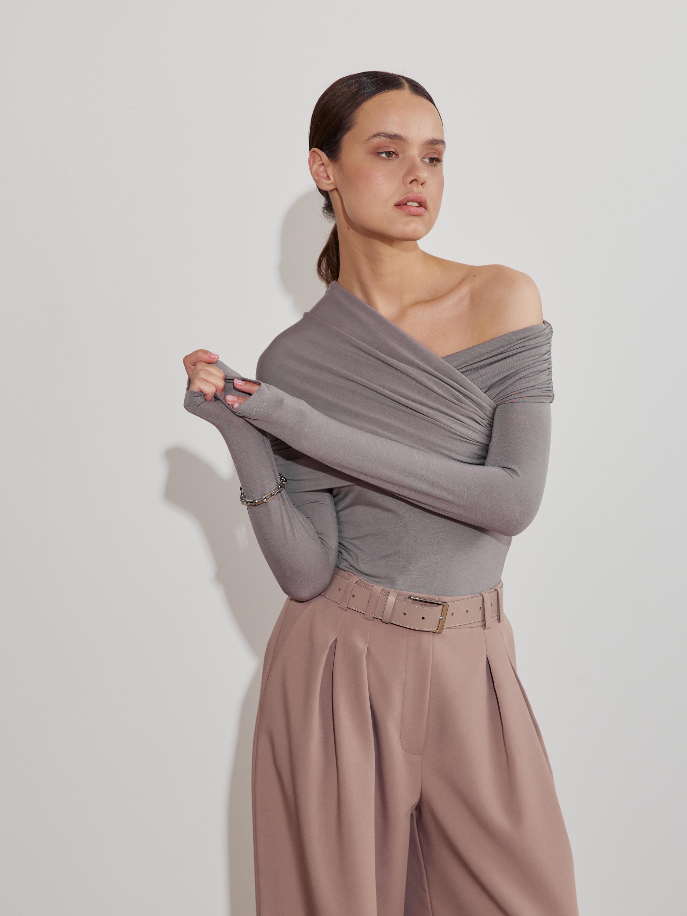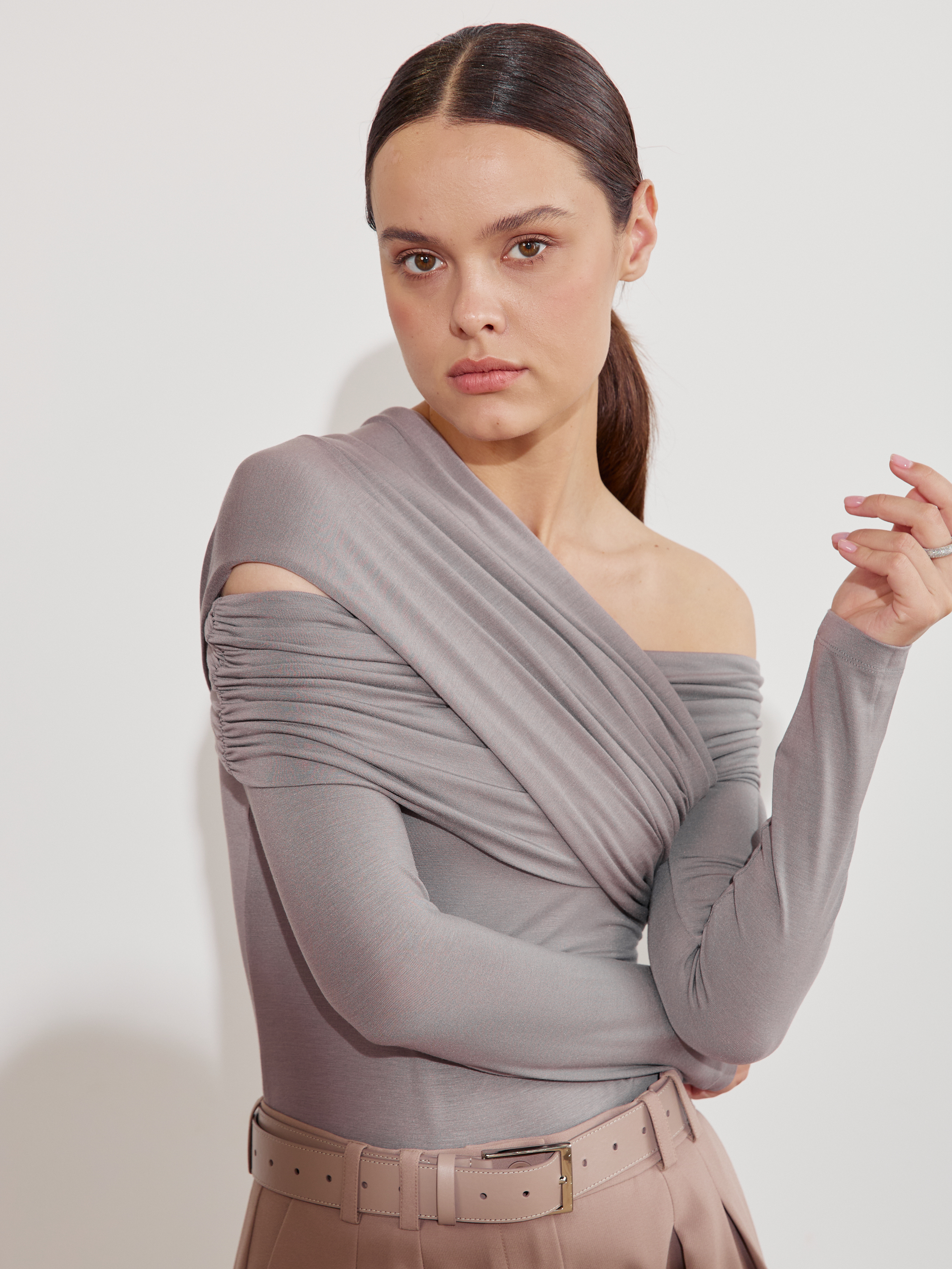 Вы можете носить боди разными способами, вариативно пользуясь драпировками на плечах: можно прикрыть плечо, можно поднять на одно плечо, создав асимметричный минималистичный образ, либо спустить драпировки ниже, показав красивые плечи.
