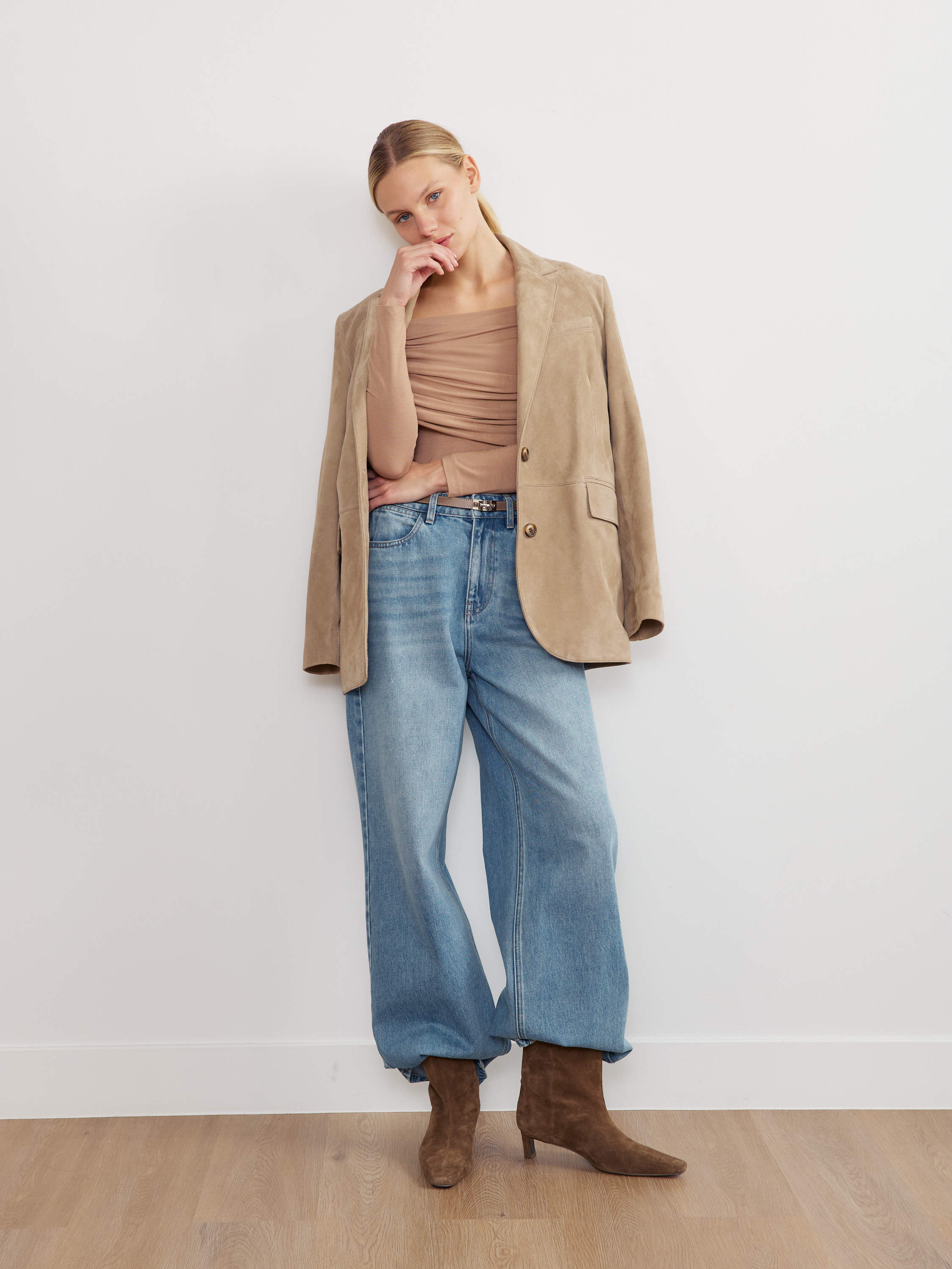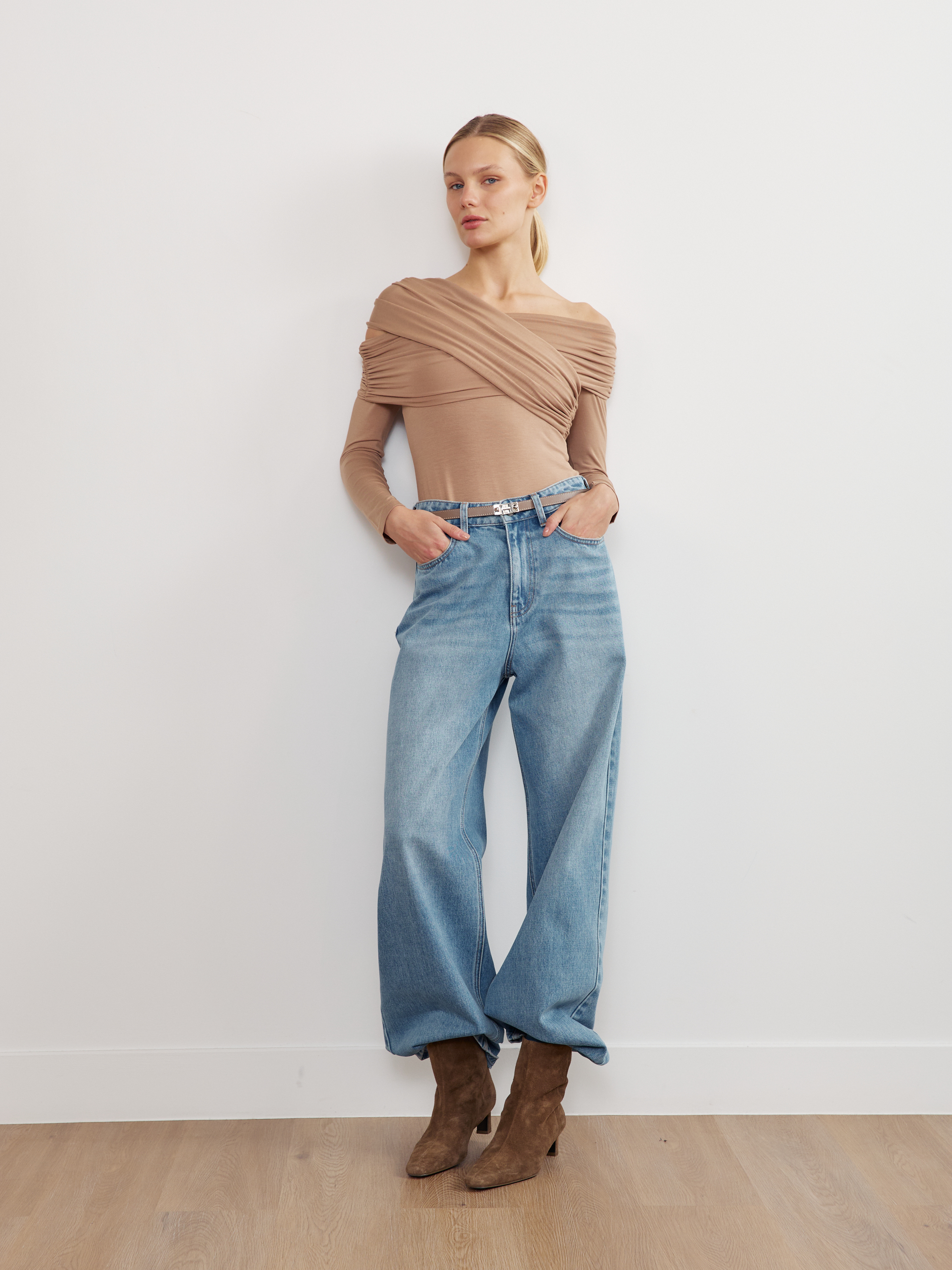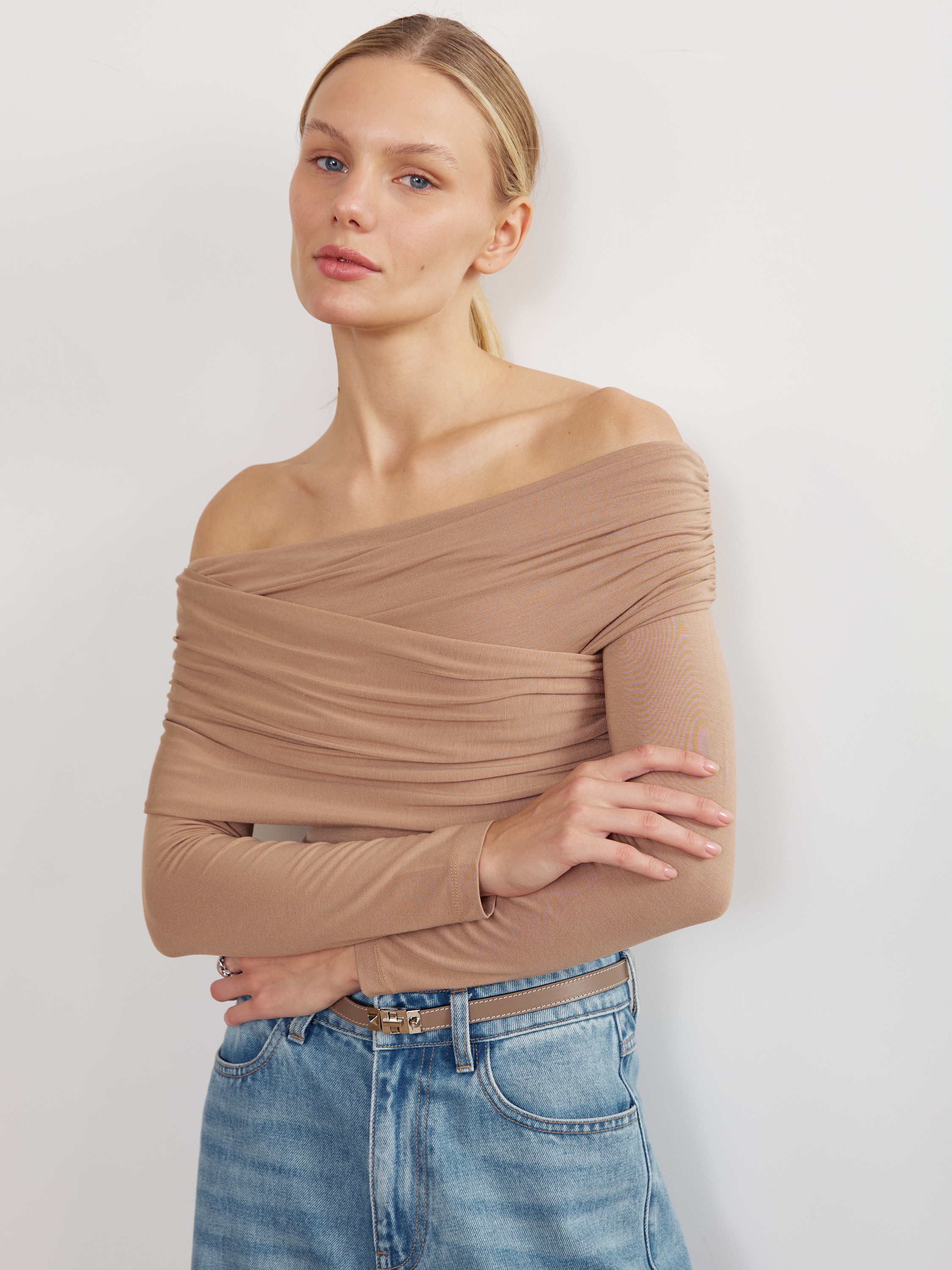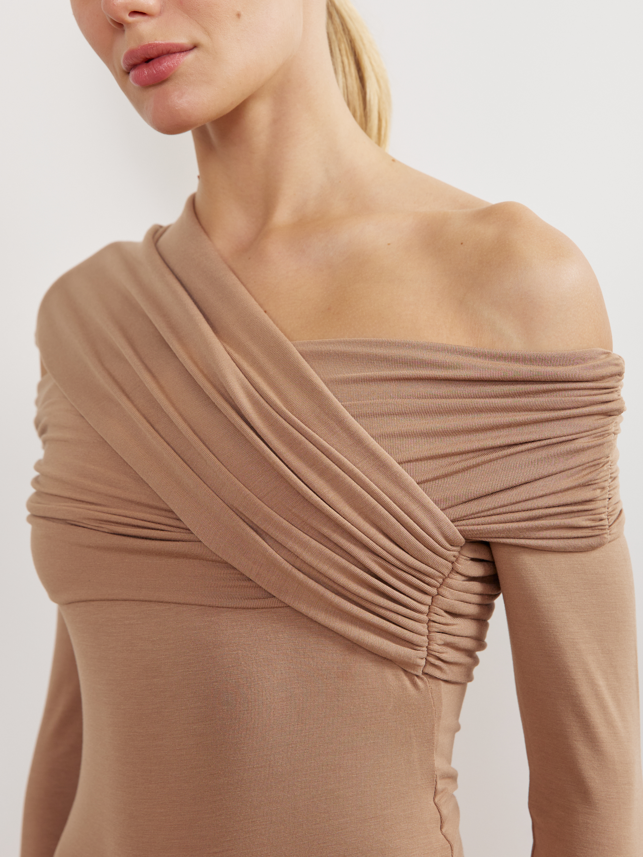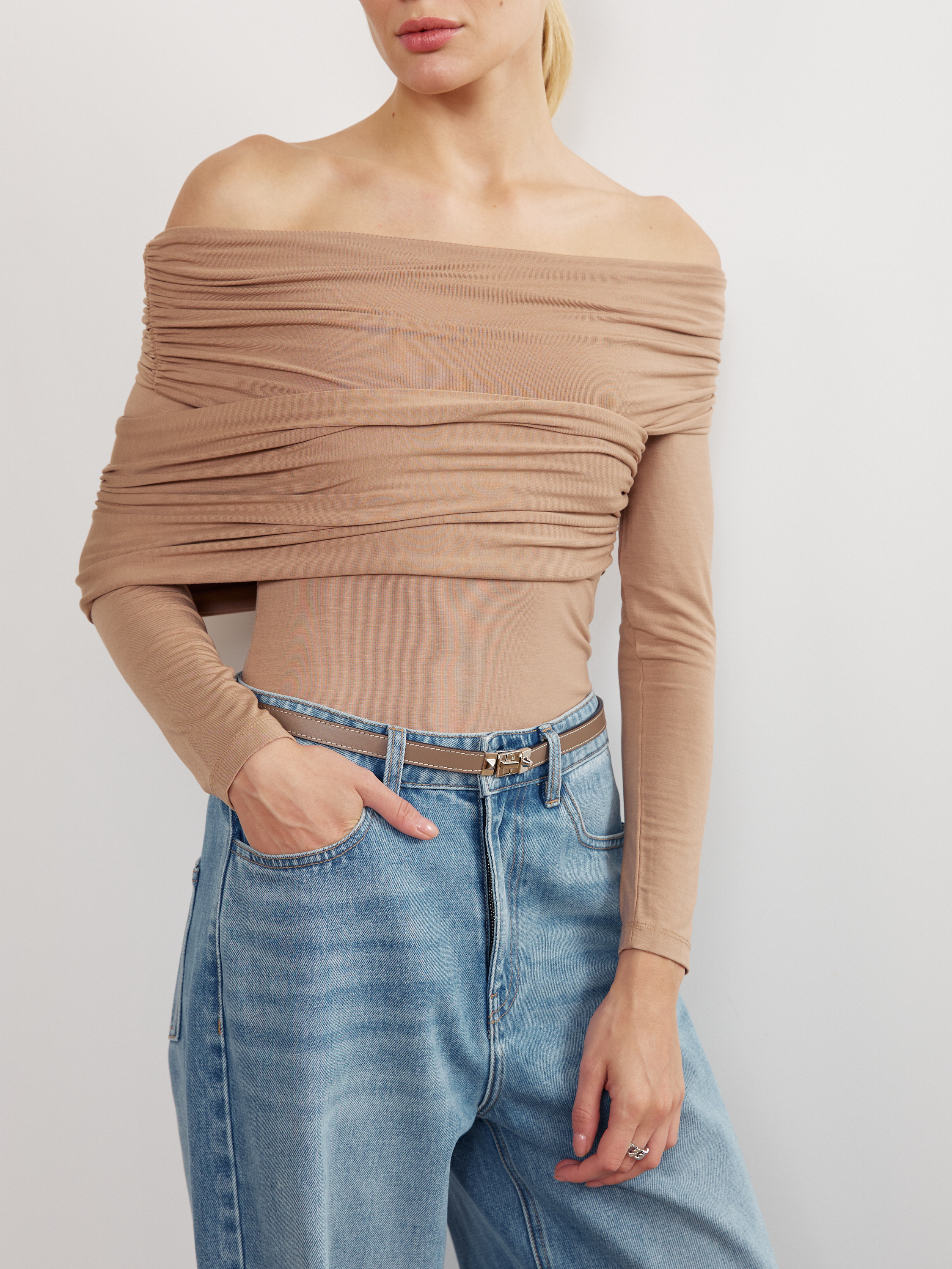 Вы можете носить боди разными способами, вариативно пользуясь драпировками на плечах: можно прикрыть ими плечи, можно спустить на одно плечо, создав асимметричный минималистичный образ, либо спустить драпировки ниже, показав красивые плечи.
