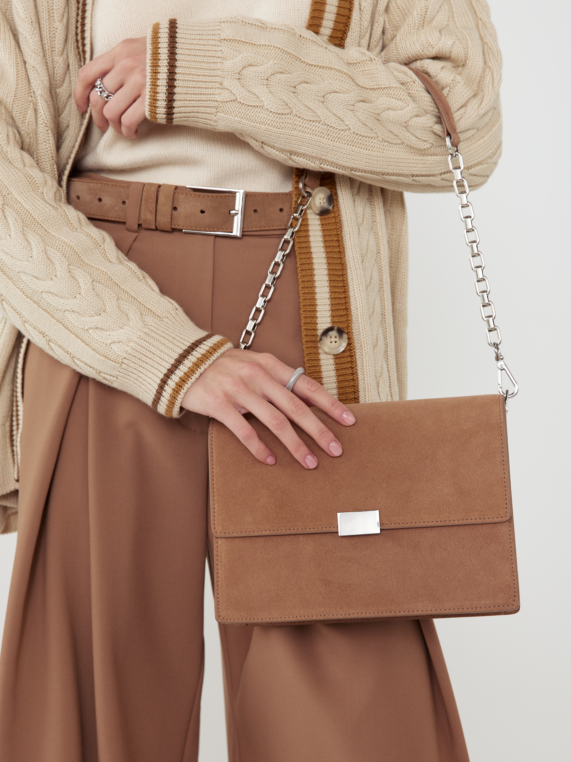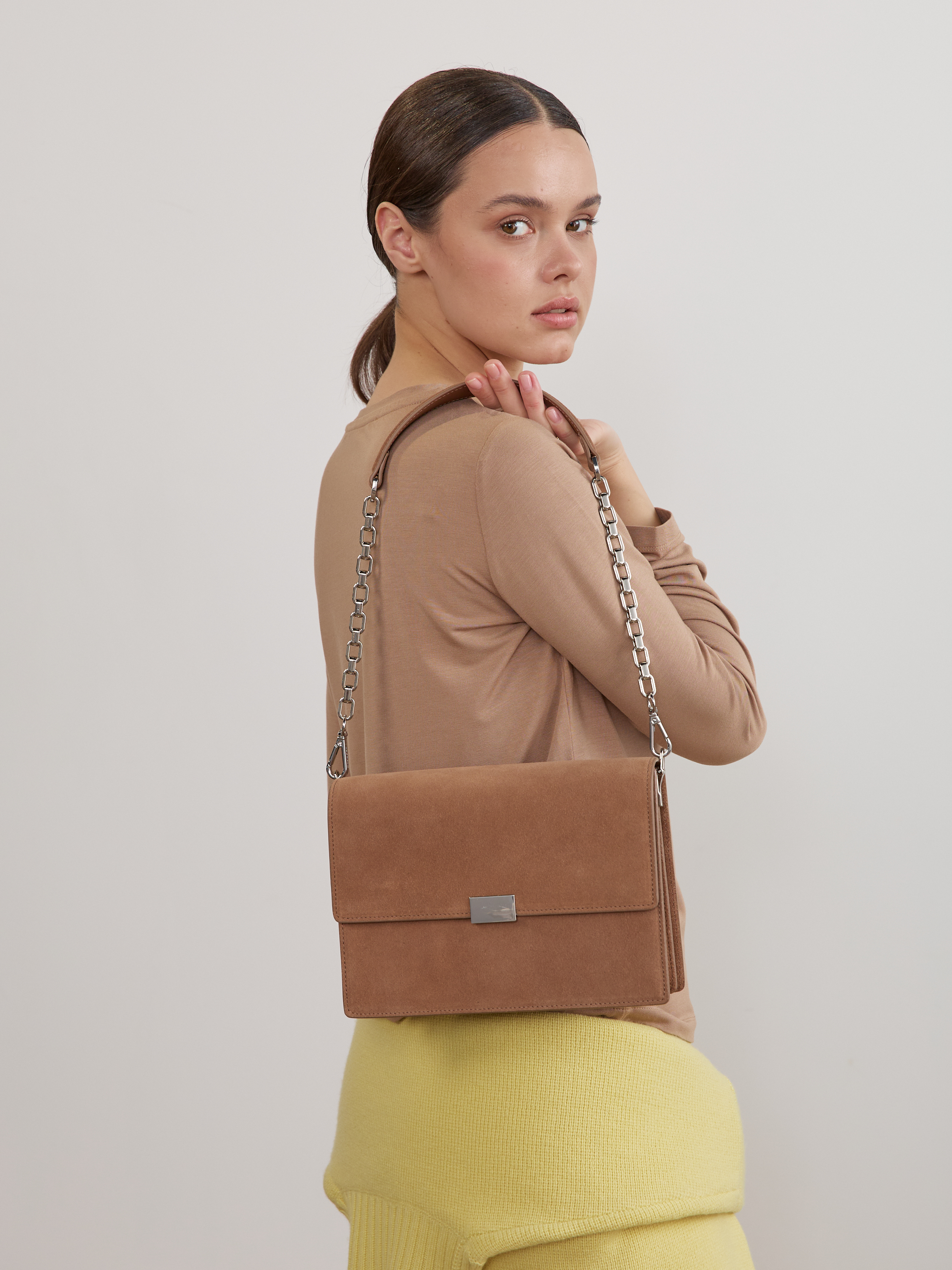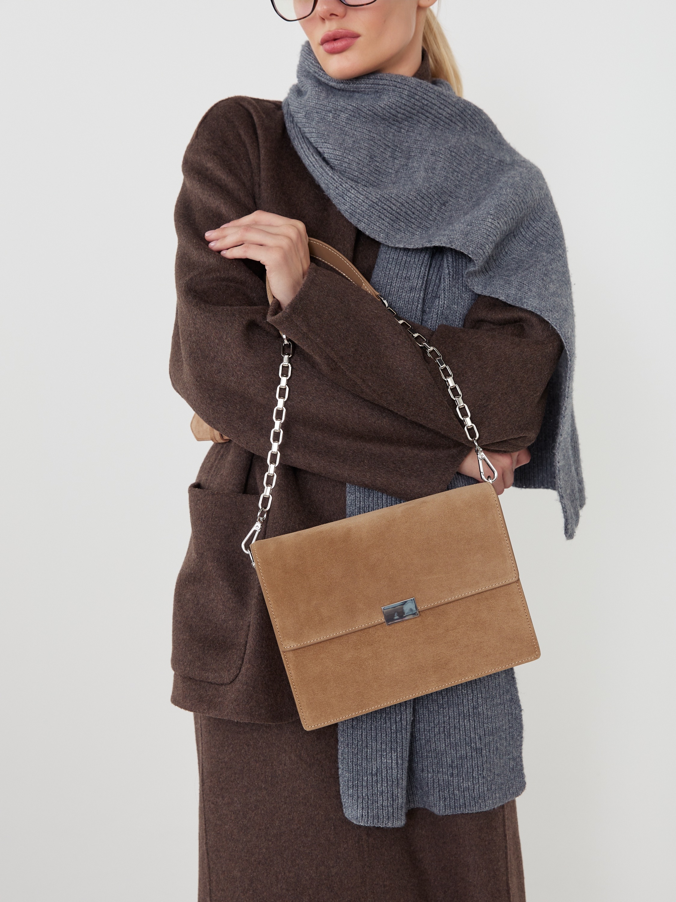 Сумка выглядит лаконично и дорого благодаря минималистичному дизайну и элегантной цепочке с кожаной вставкой.
