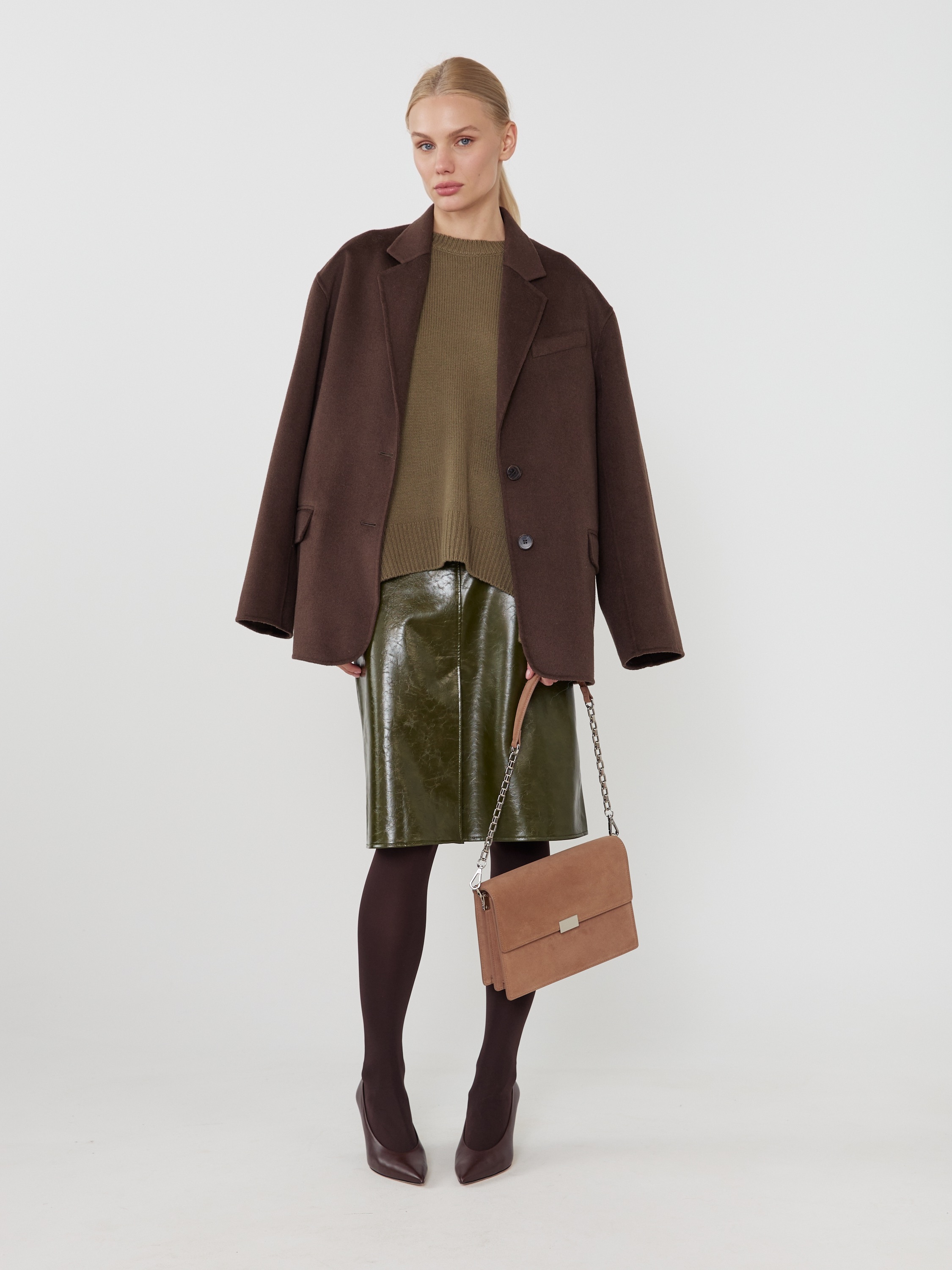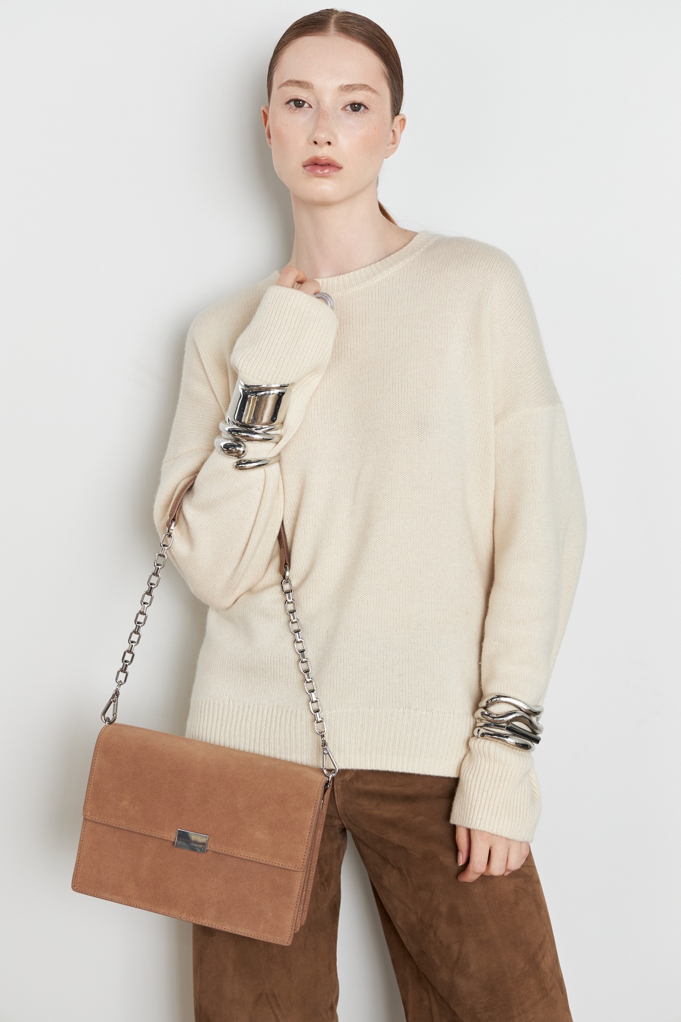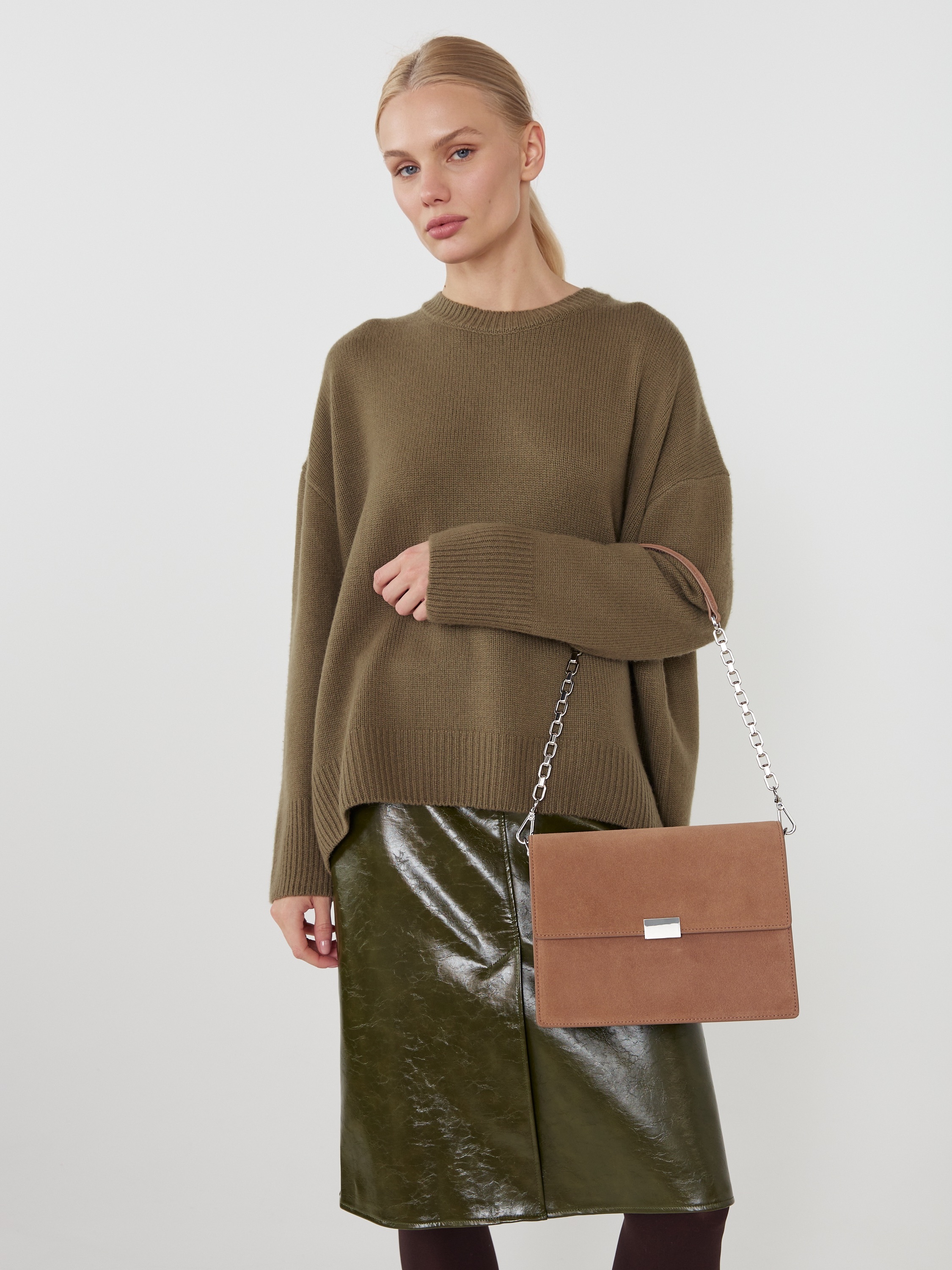 Сумка выглядит лаконично и дорого благодаря минималистичному дизайну и элегантной цепочке с кожаной вставкой.