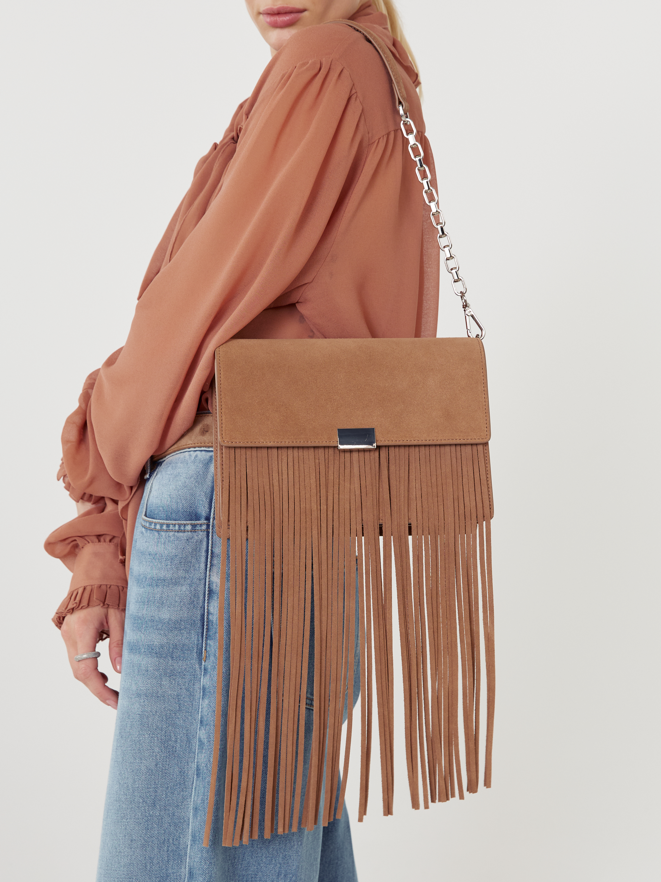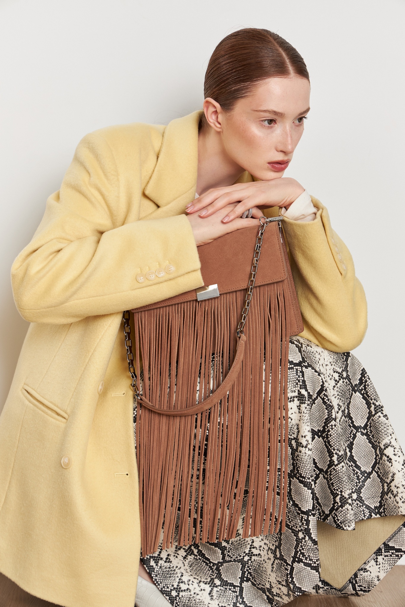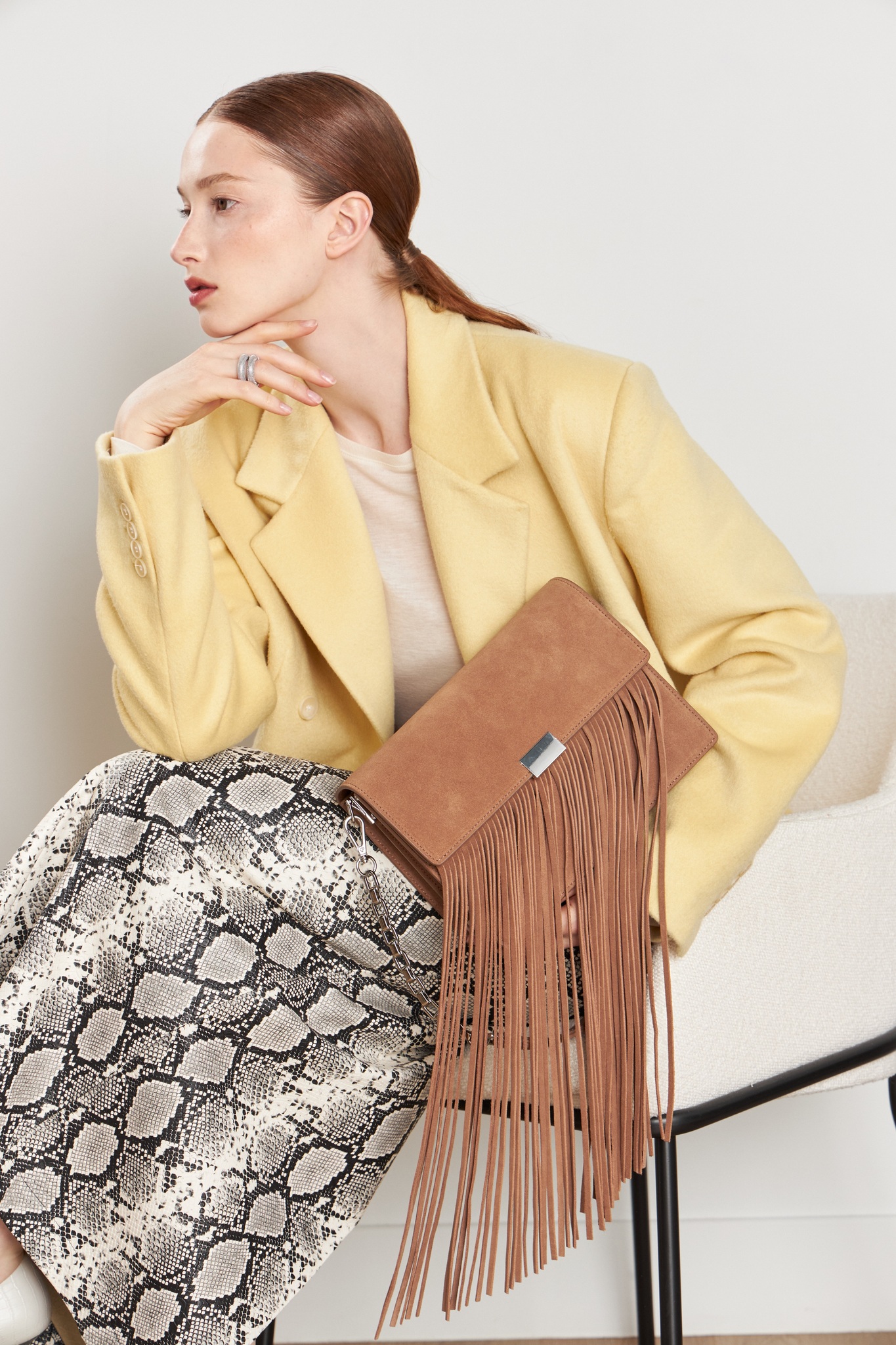 Потому что бахрома пристегивается легким движением руки, чтобы ваша базовая сумка превратилась в ультрамодную сумочку в стиле бохо и составила компанию вашим любимым казакам, платьям с воланами и рюшами, замшевым пиджакам или блузкам сложного кроя.