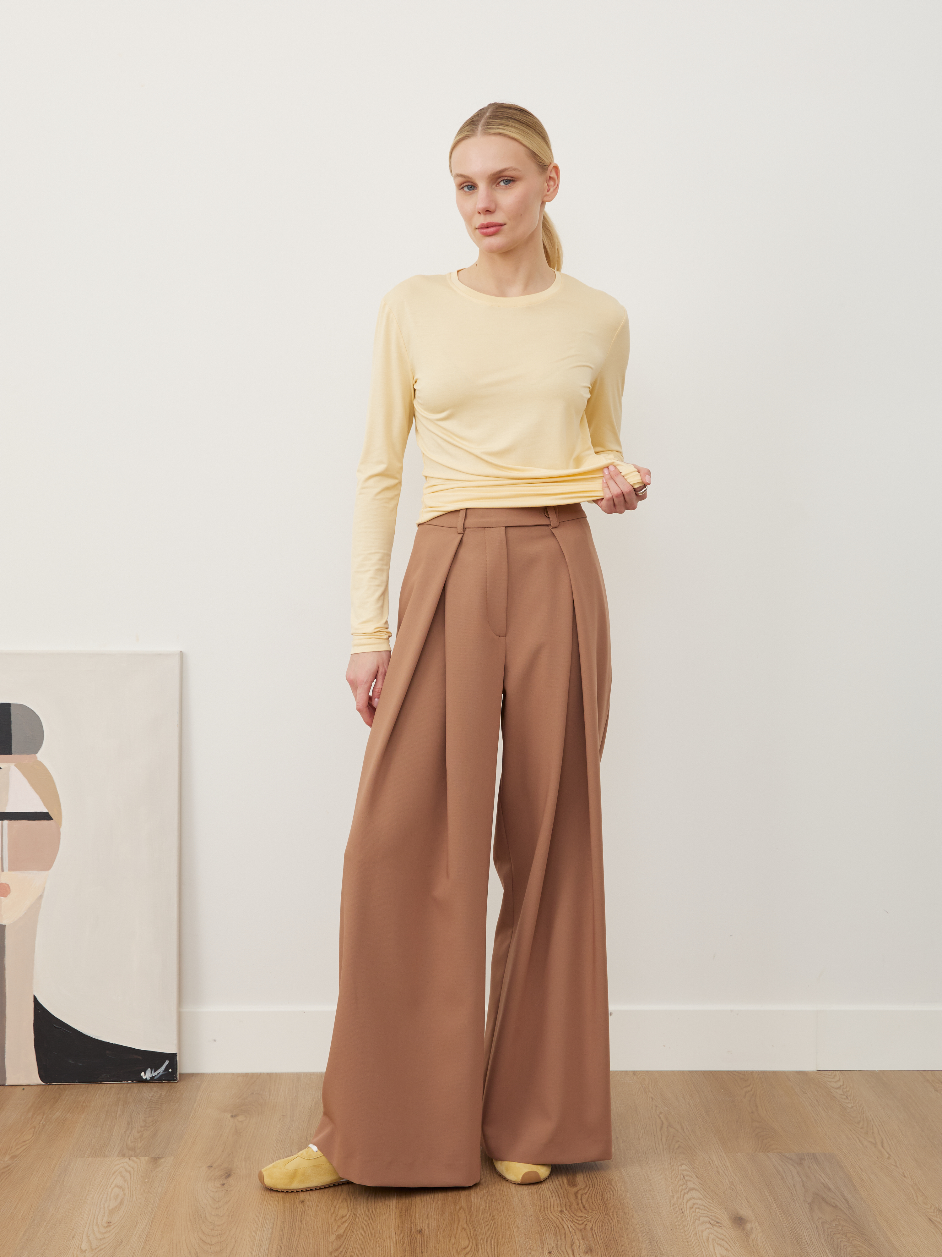 Благодаря специальному крою защипов в брюки можно незаметно и комфортно заправить любой верх.