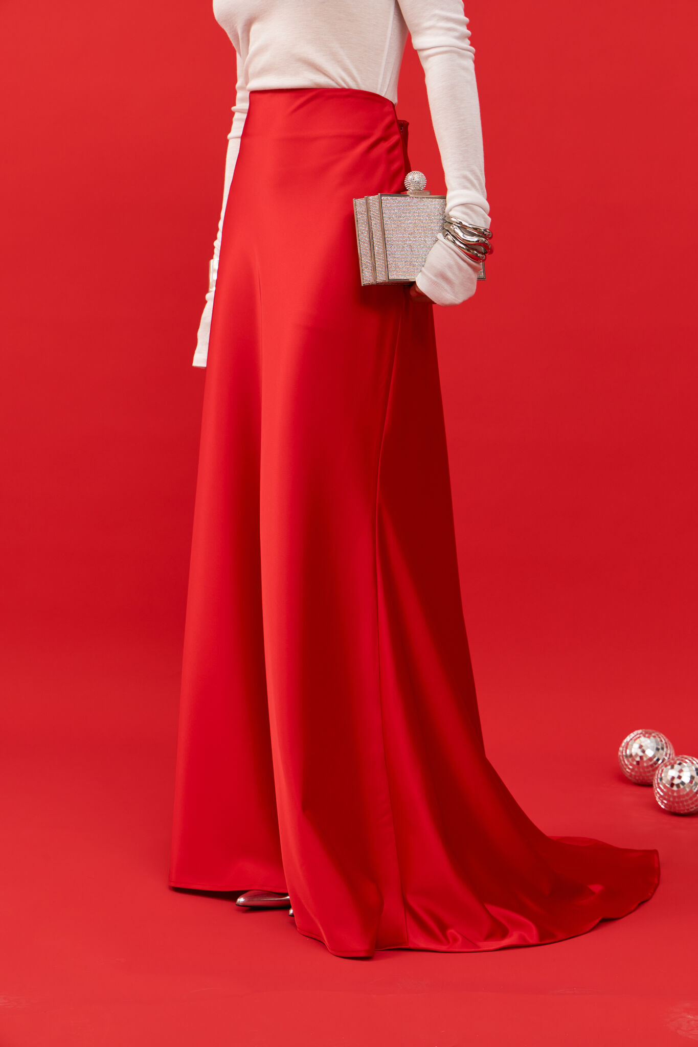 Юбка из благородного, тяжелого, струящегося и немнущегося сатина с роскошным шлейфом.