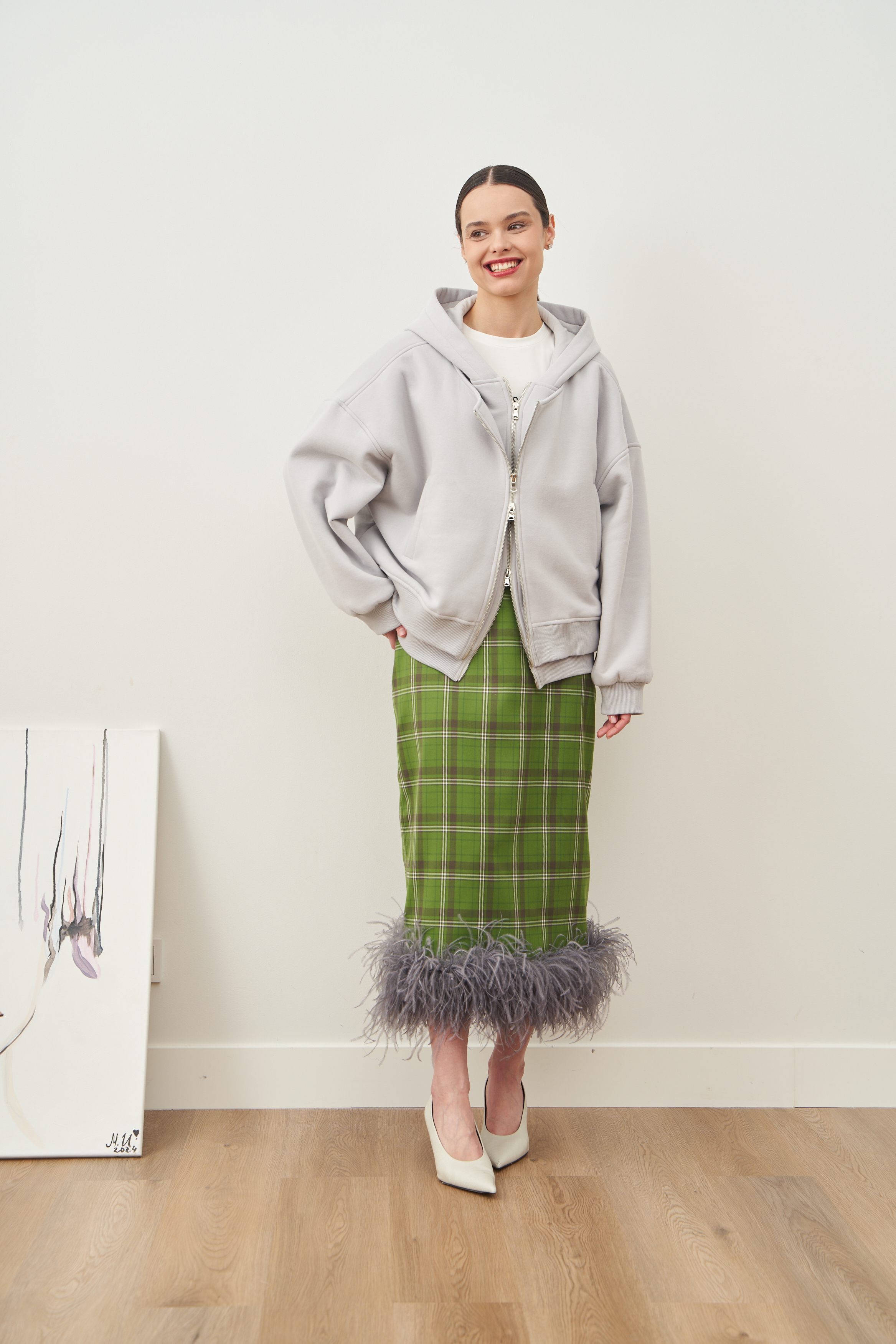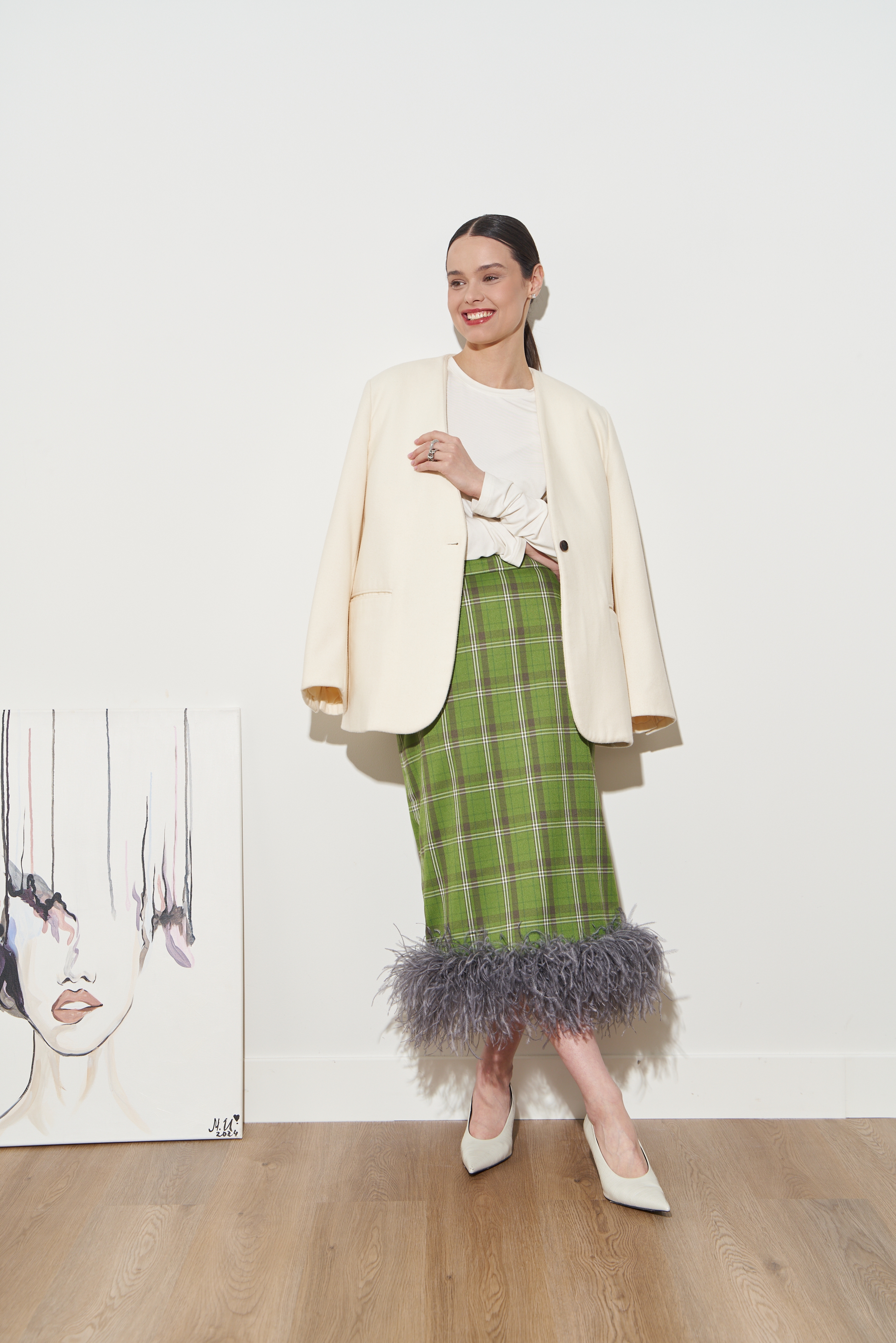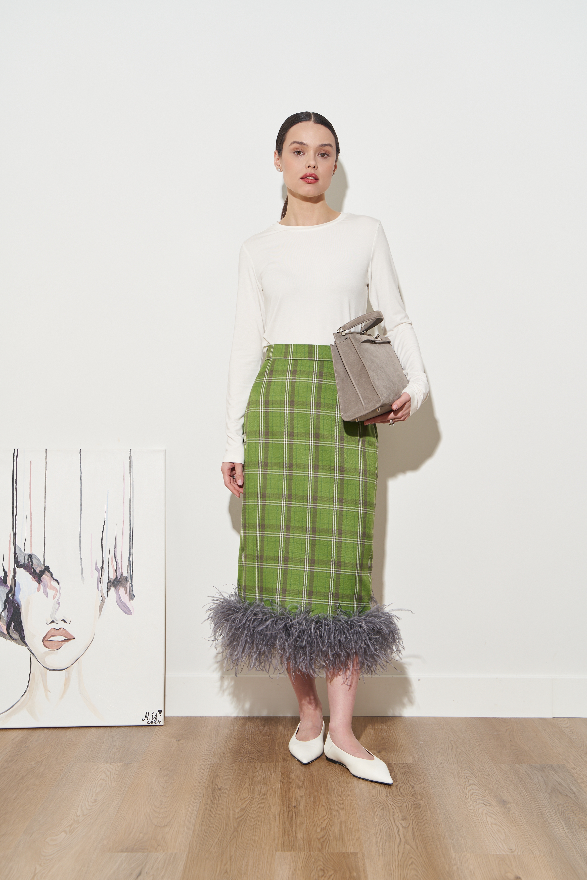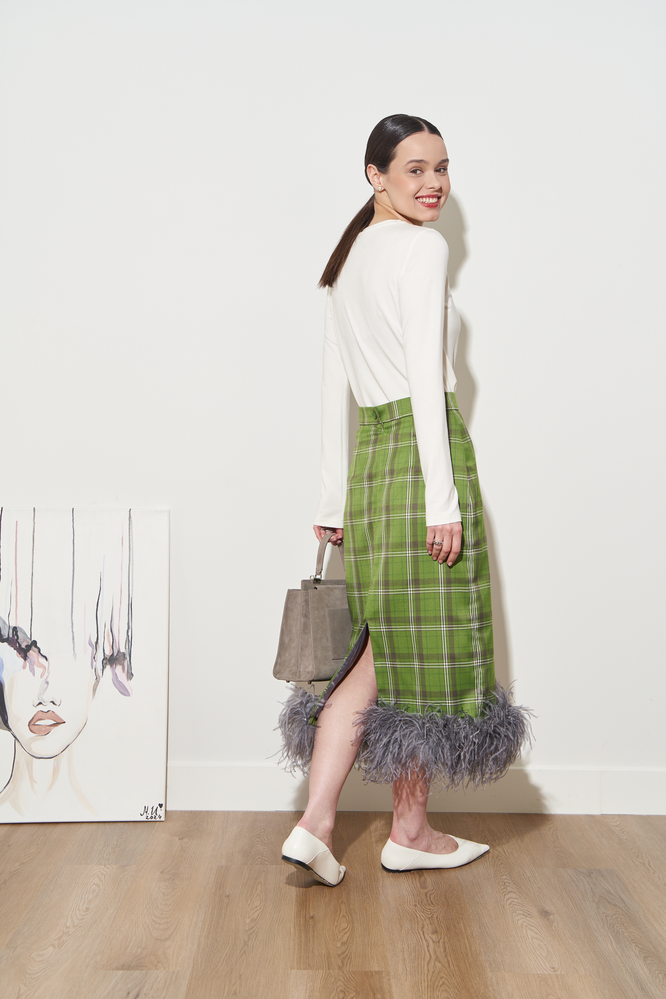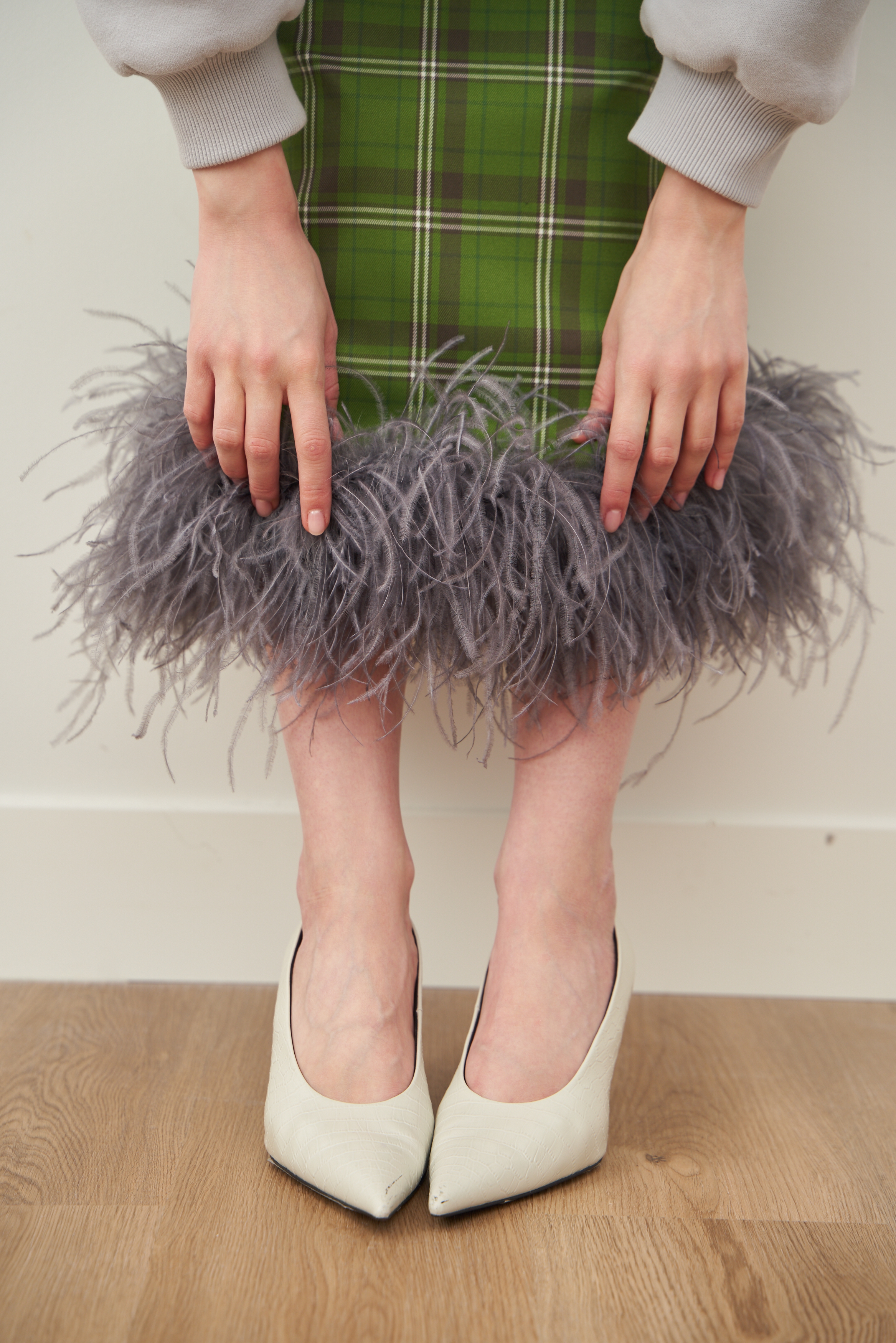 Перья крепятся к юбке на специальные кнопки, чтобы вы могли снять их перед тем, как постирать юбку или отдать ее в химчистку.