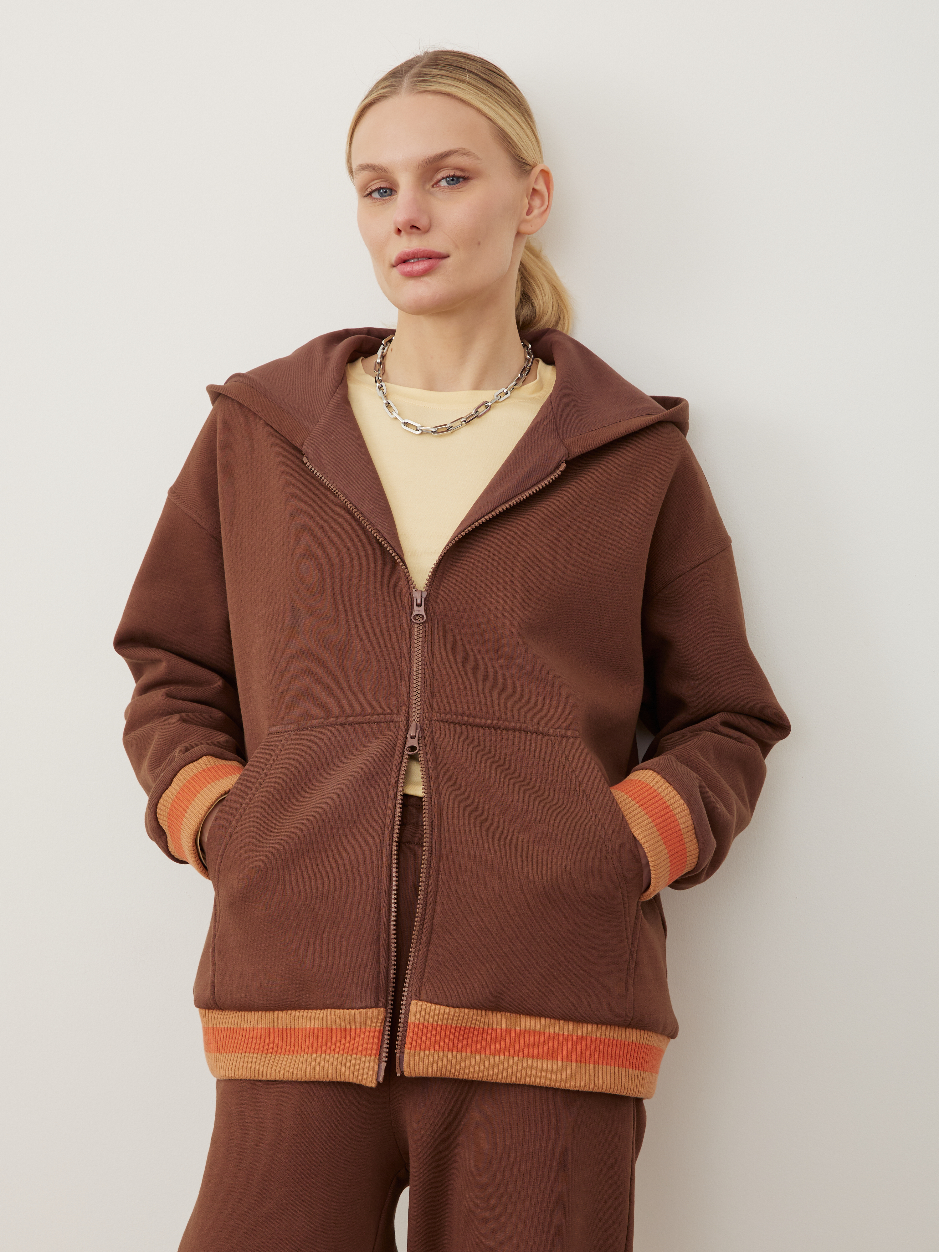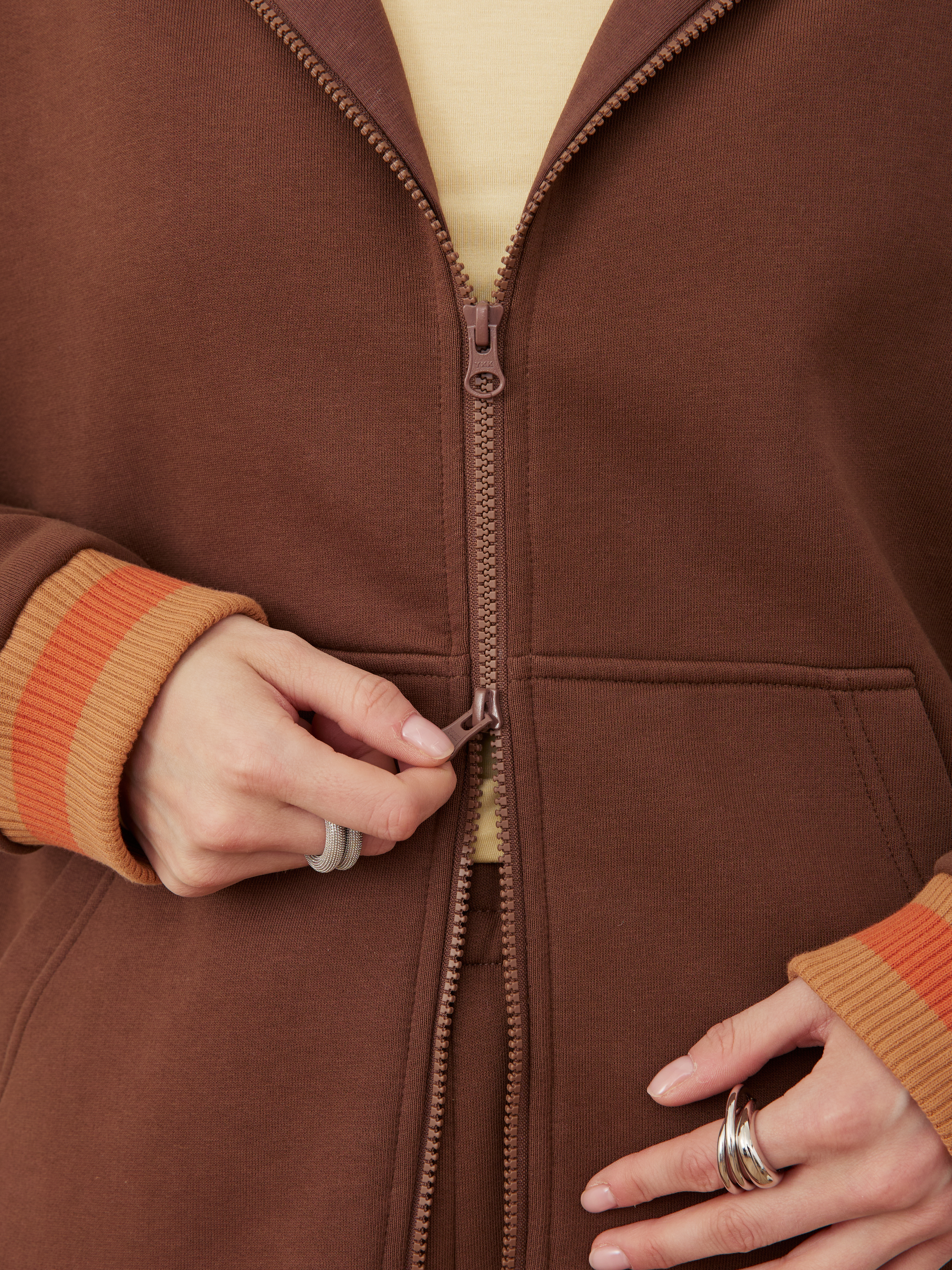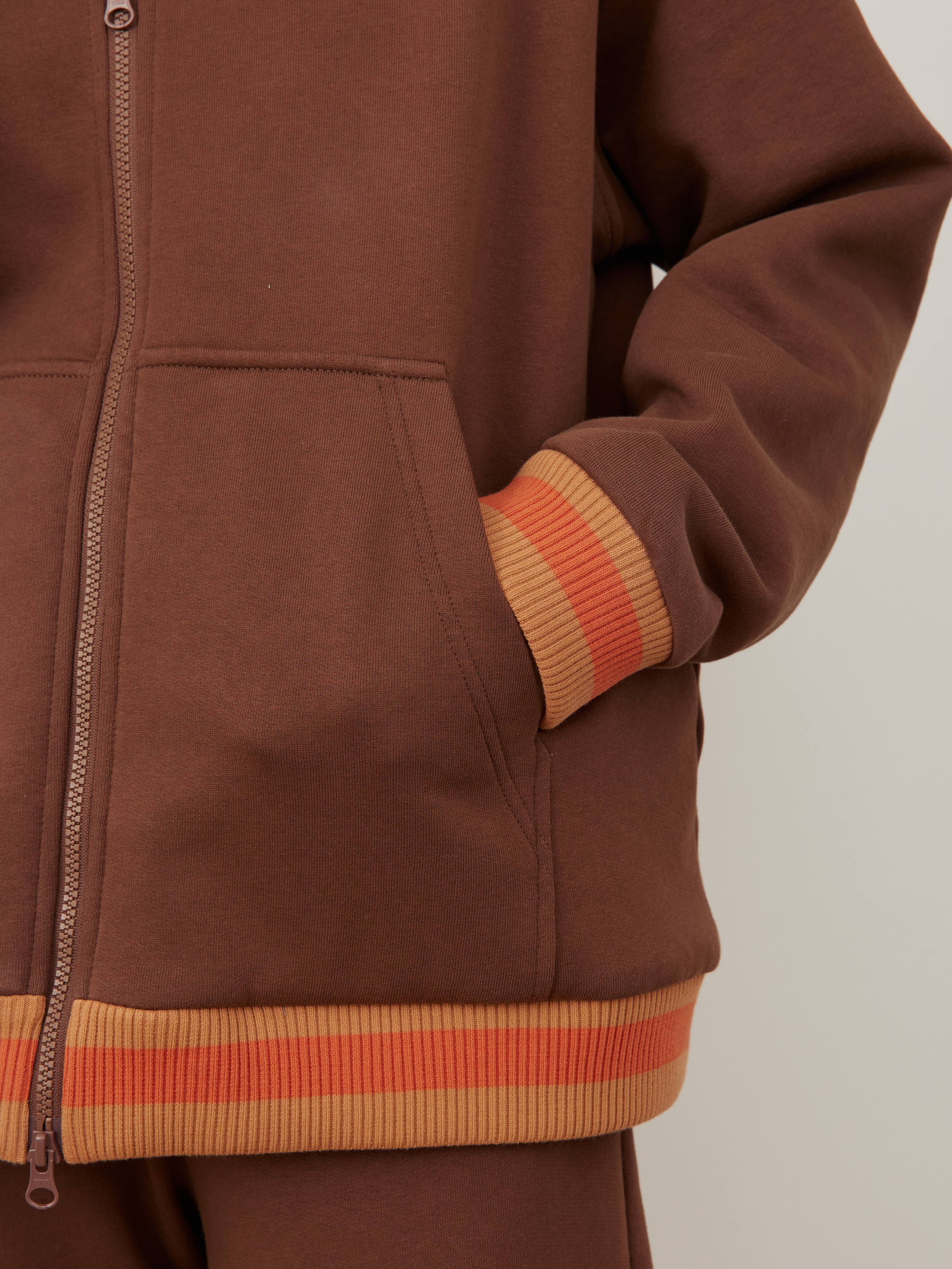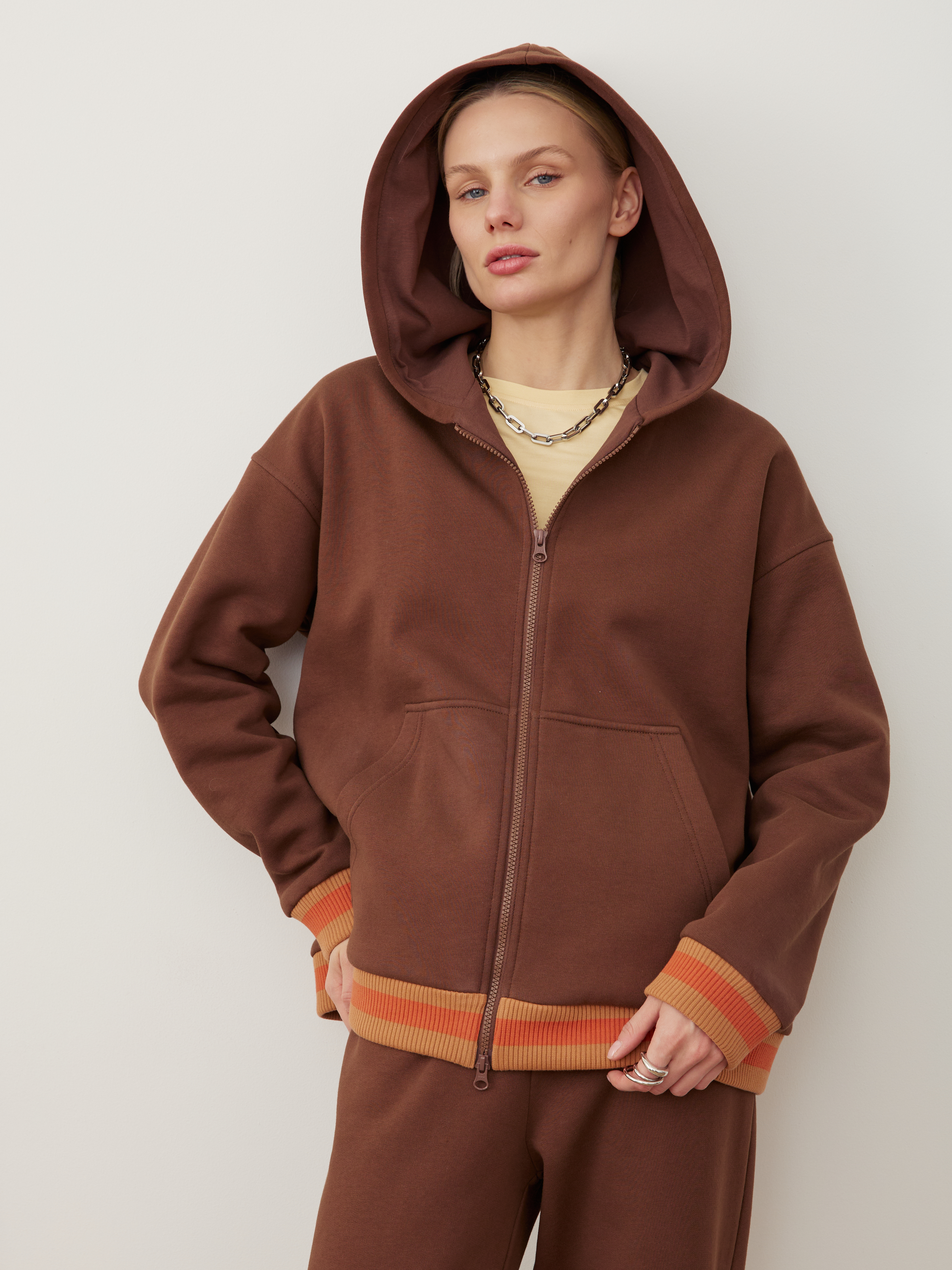 У олимпийки тонкая подкладка с натуральным составом, благодаря чему изнанка футера будет всегда выглядеть аккуратно.