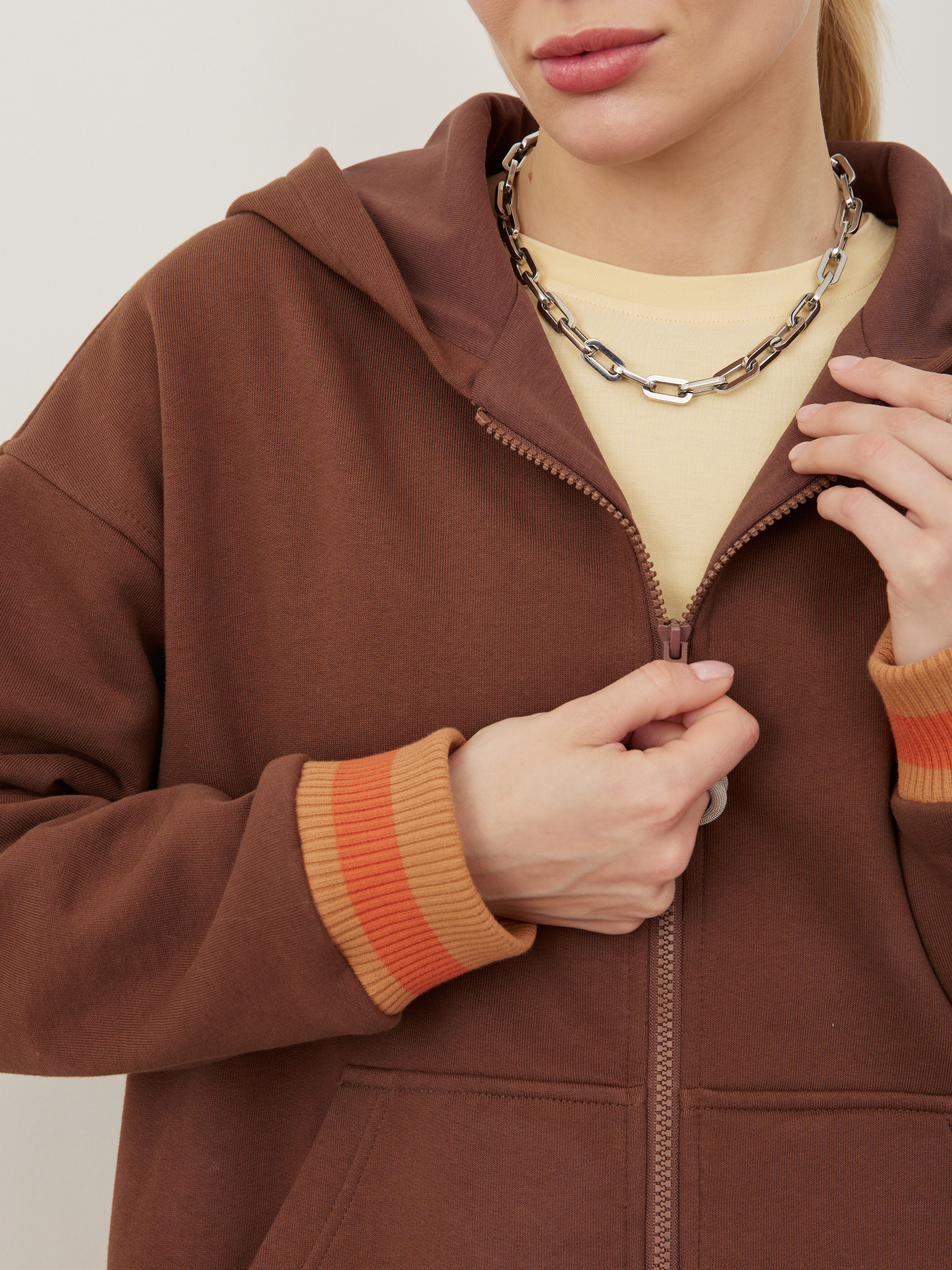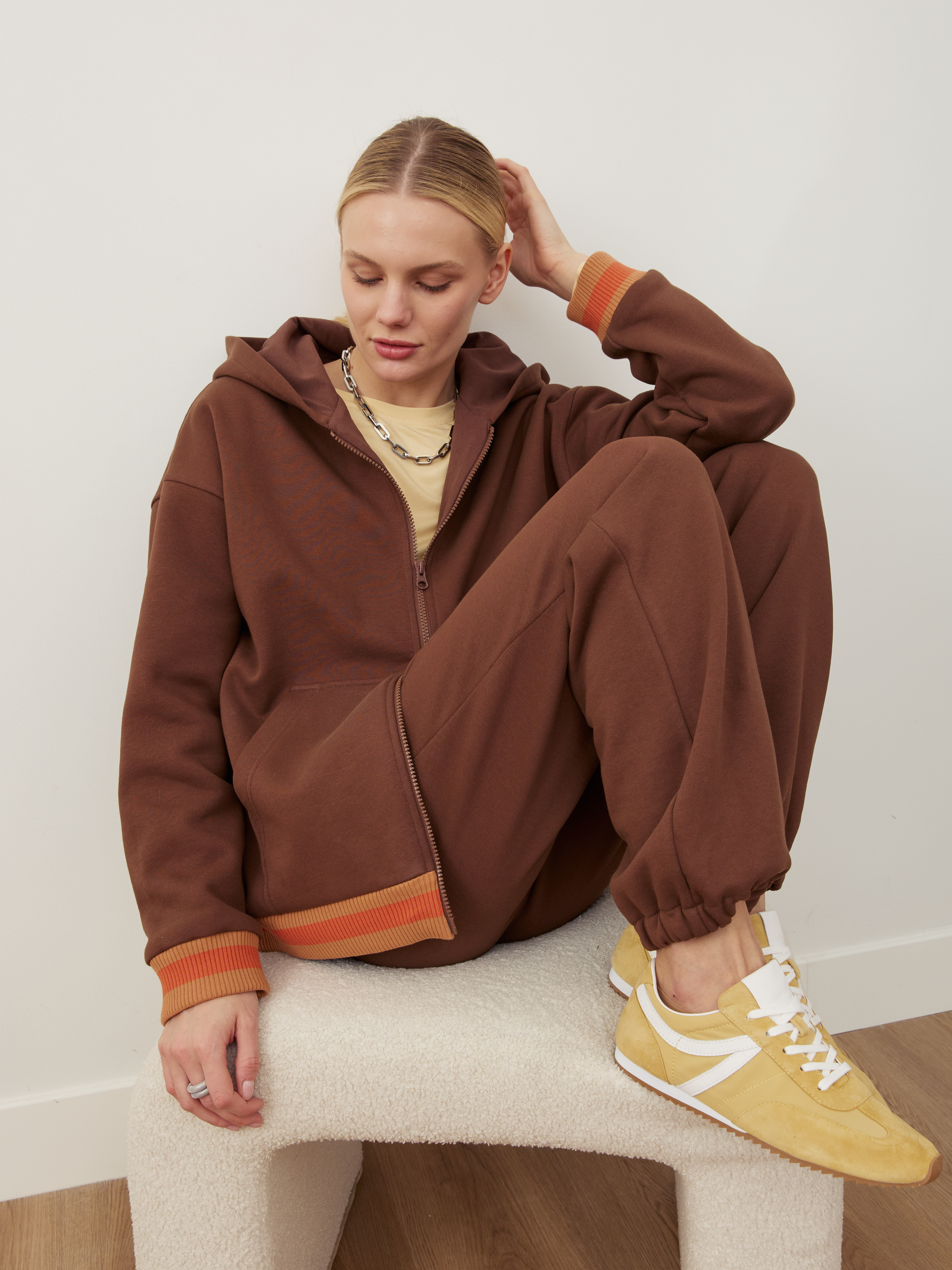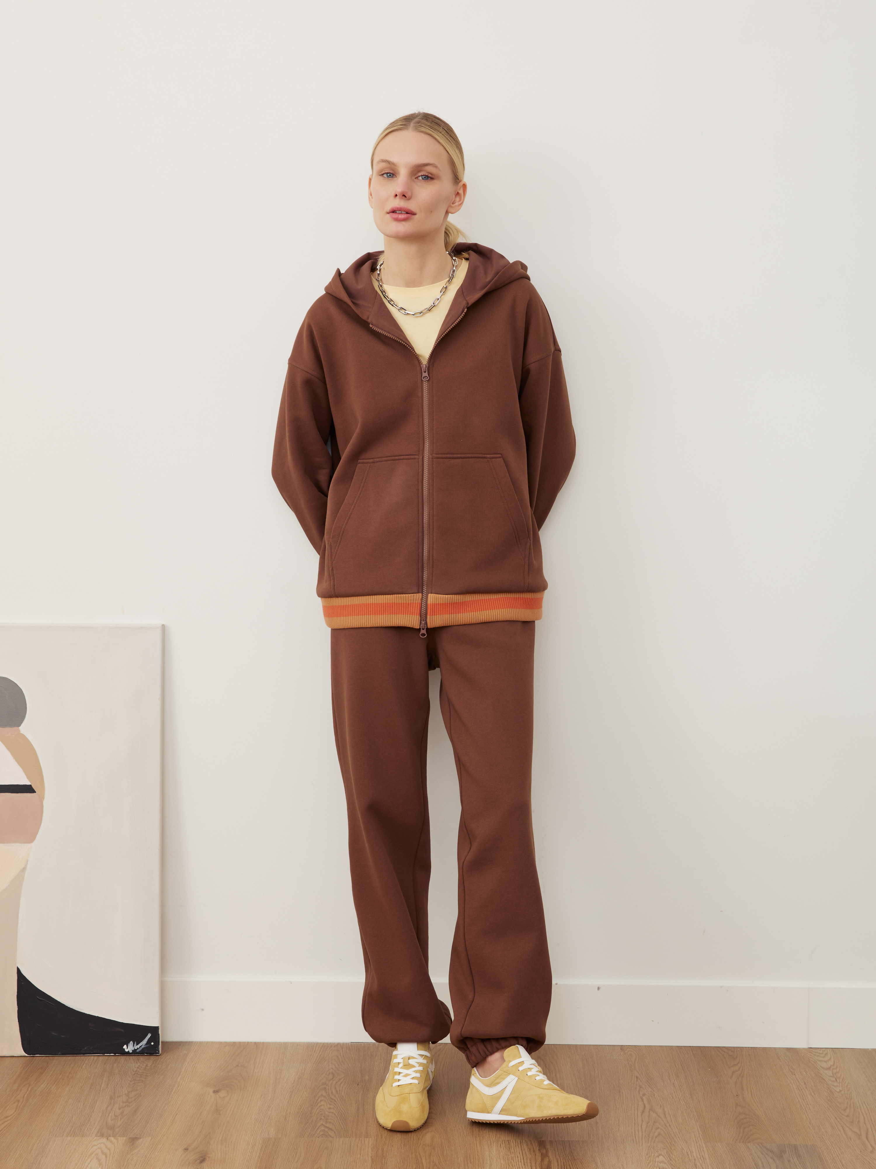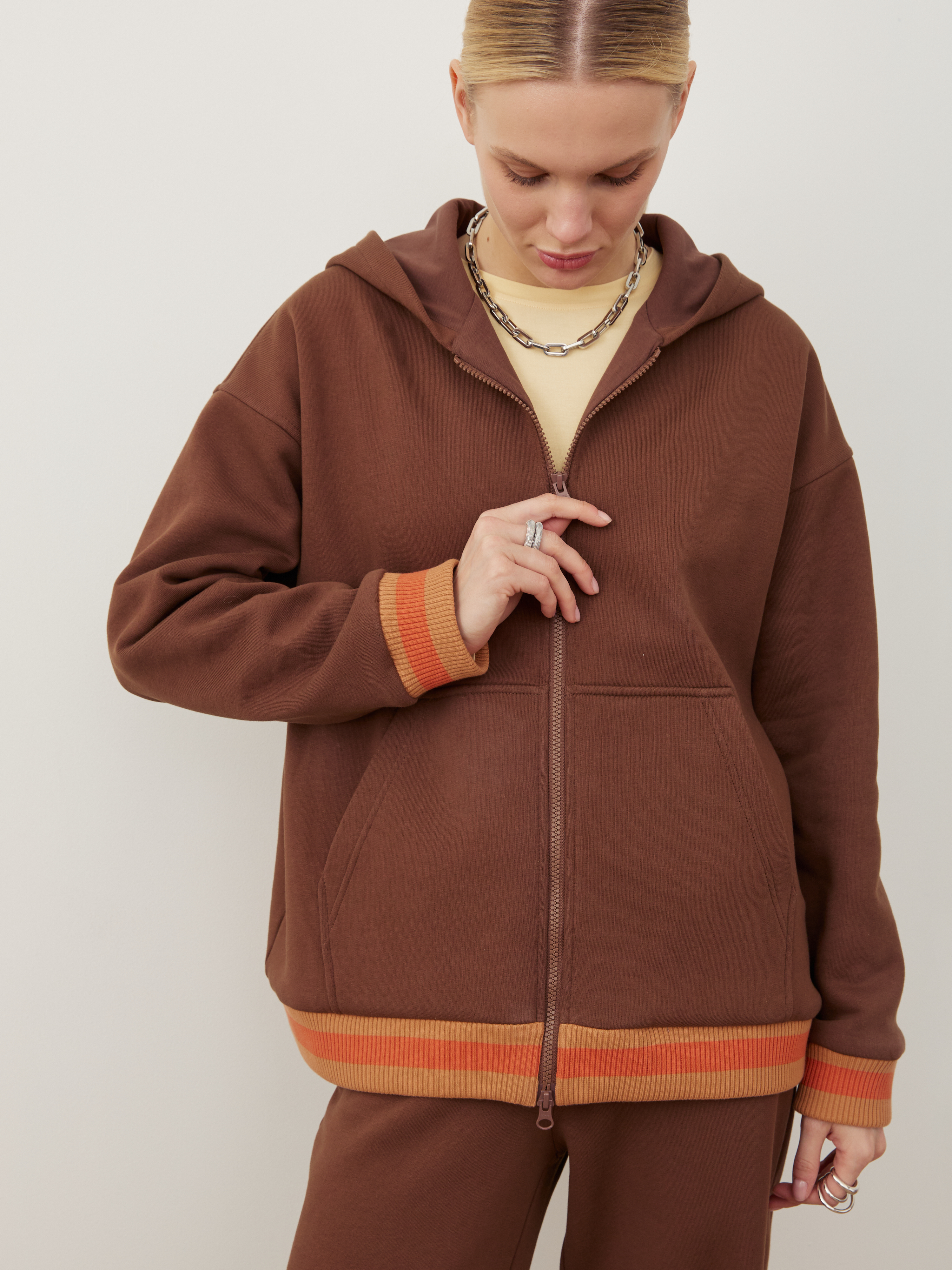 У олимпийки тонкая подкладка с натуральным составом, благодаря чему изнанка футера будет всегда выглядеть аккуратно.