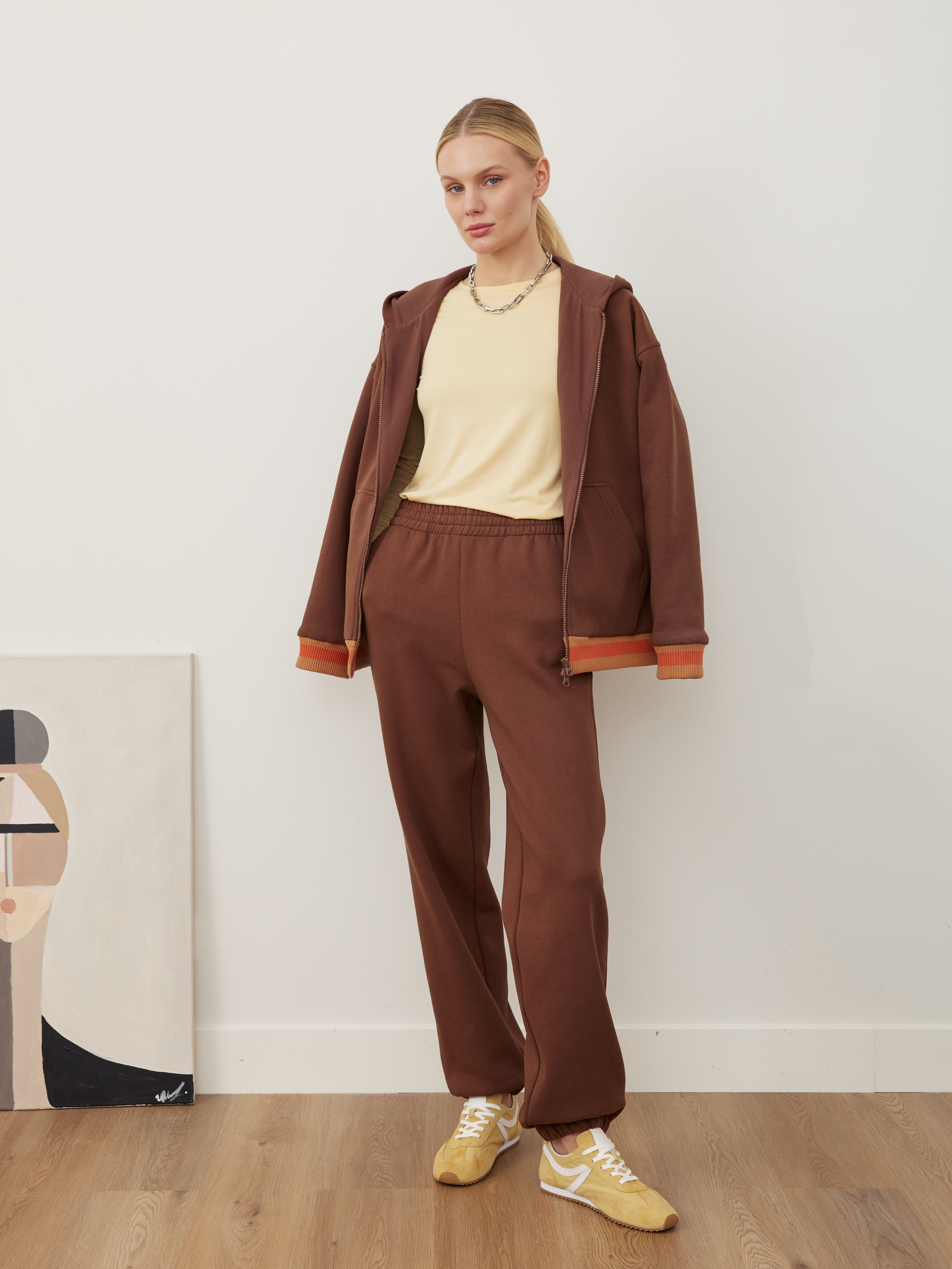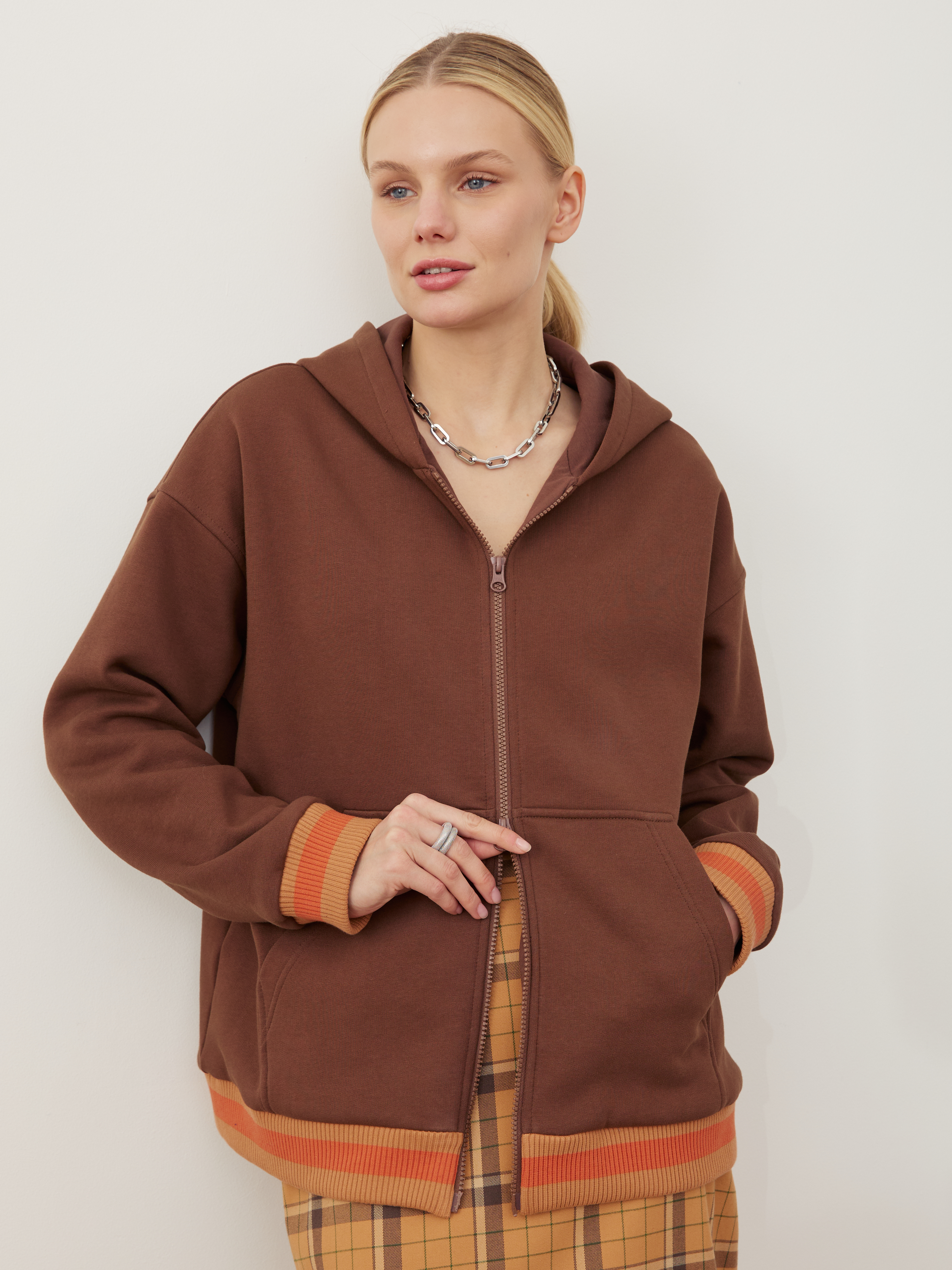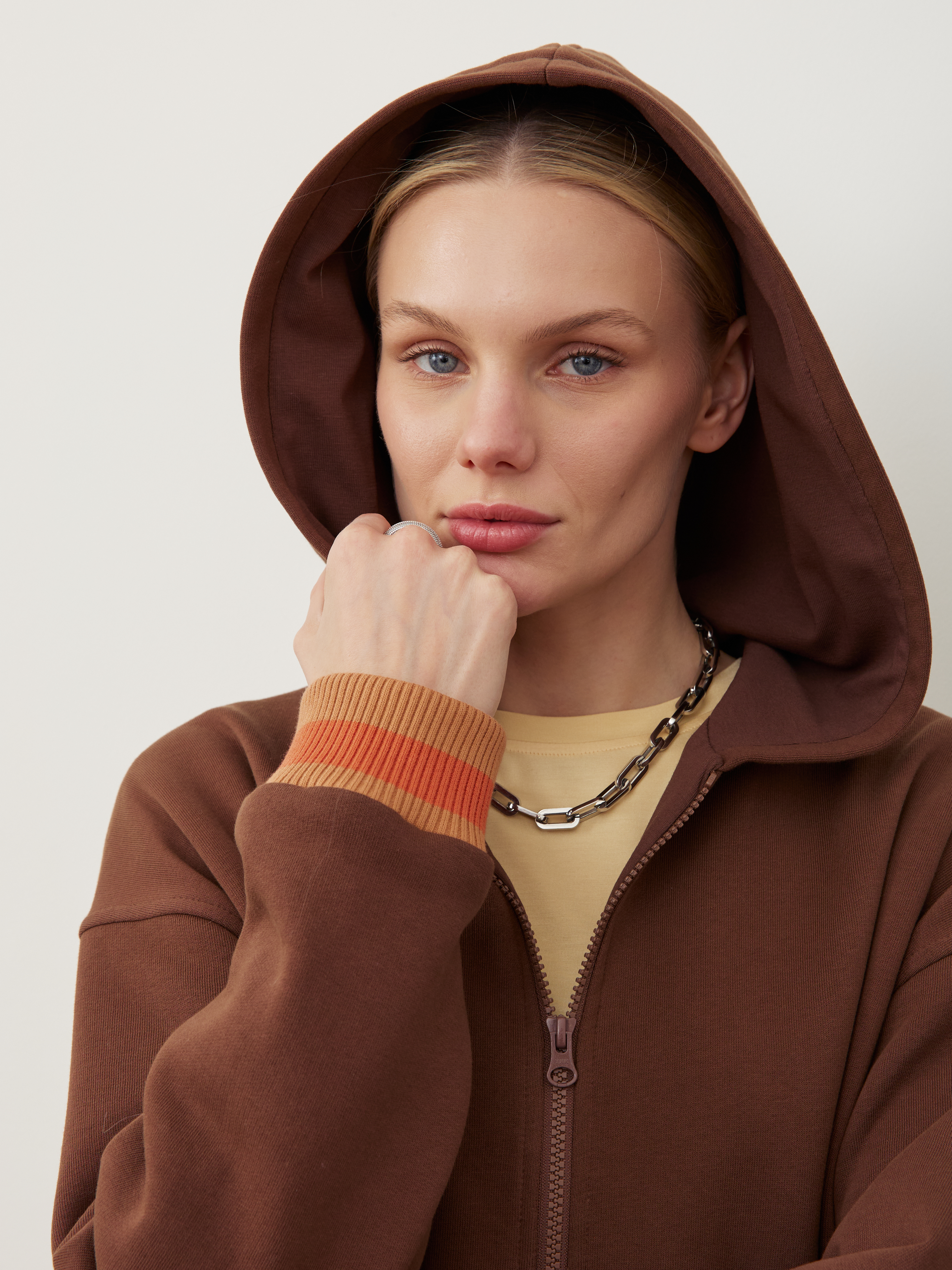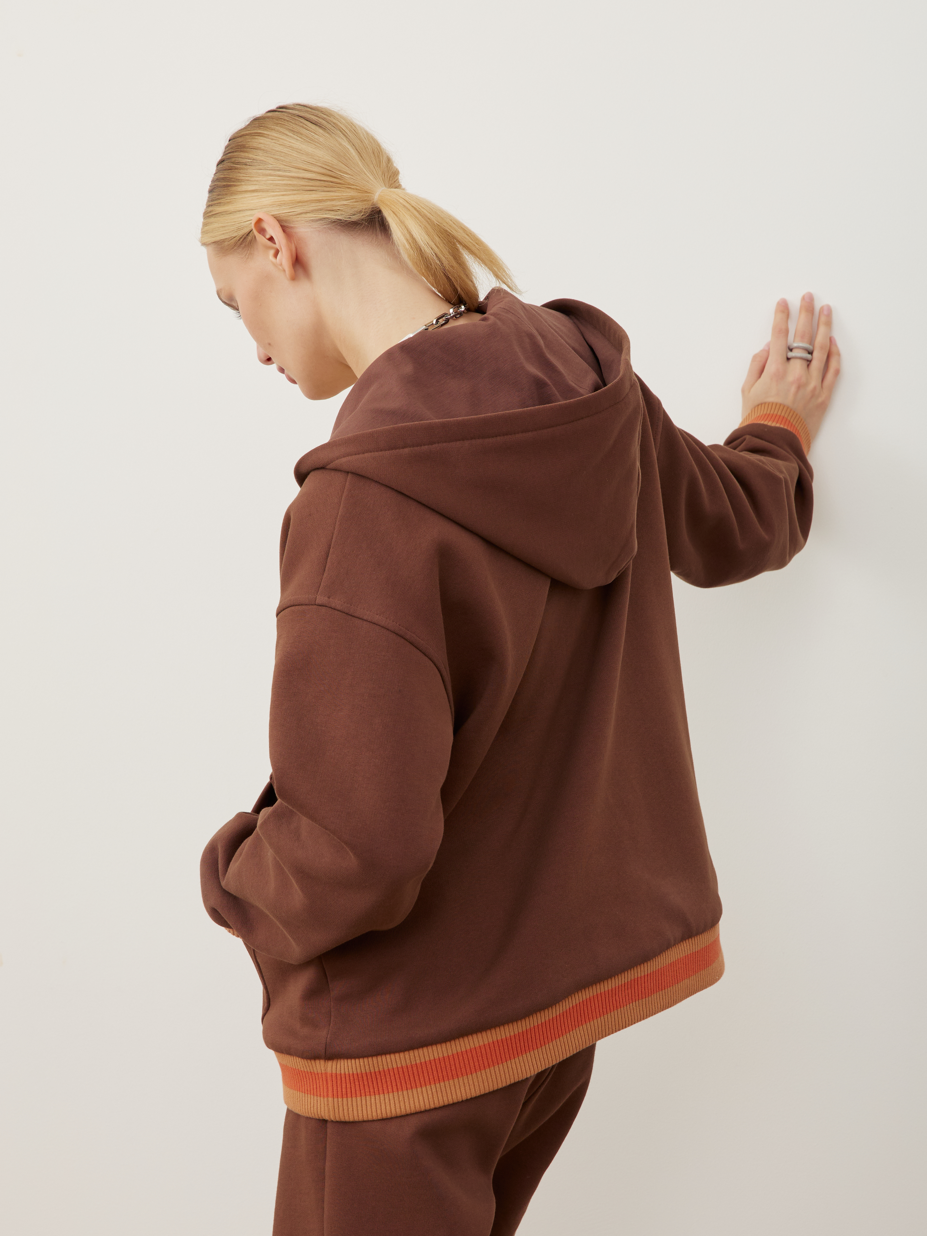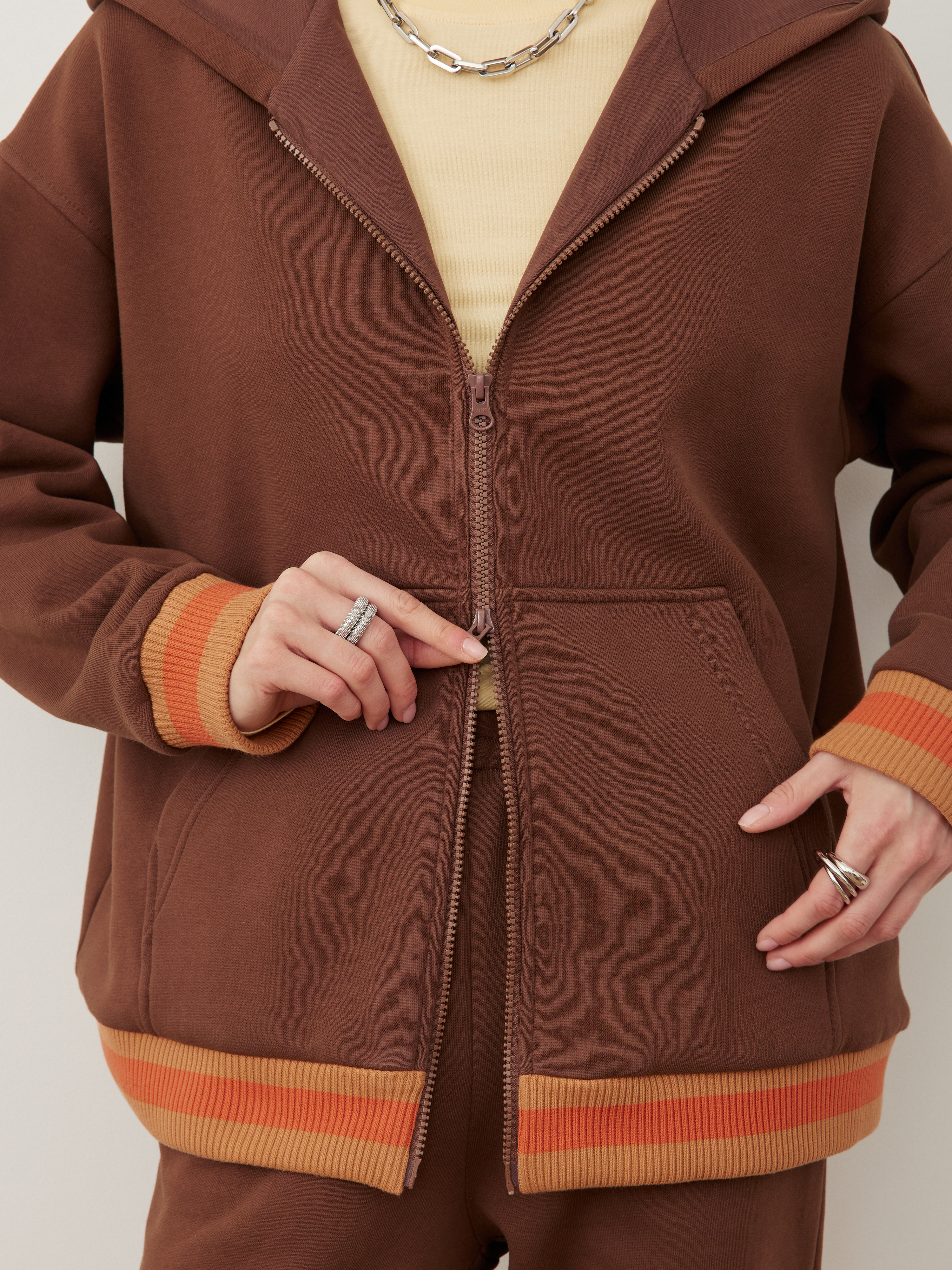 У олимпийки тонкая подкладка с натуральным составом, благодаря чему изнанка футера будет всегда выглядеть аккуратно.
