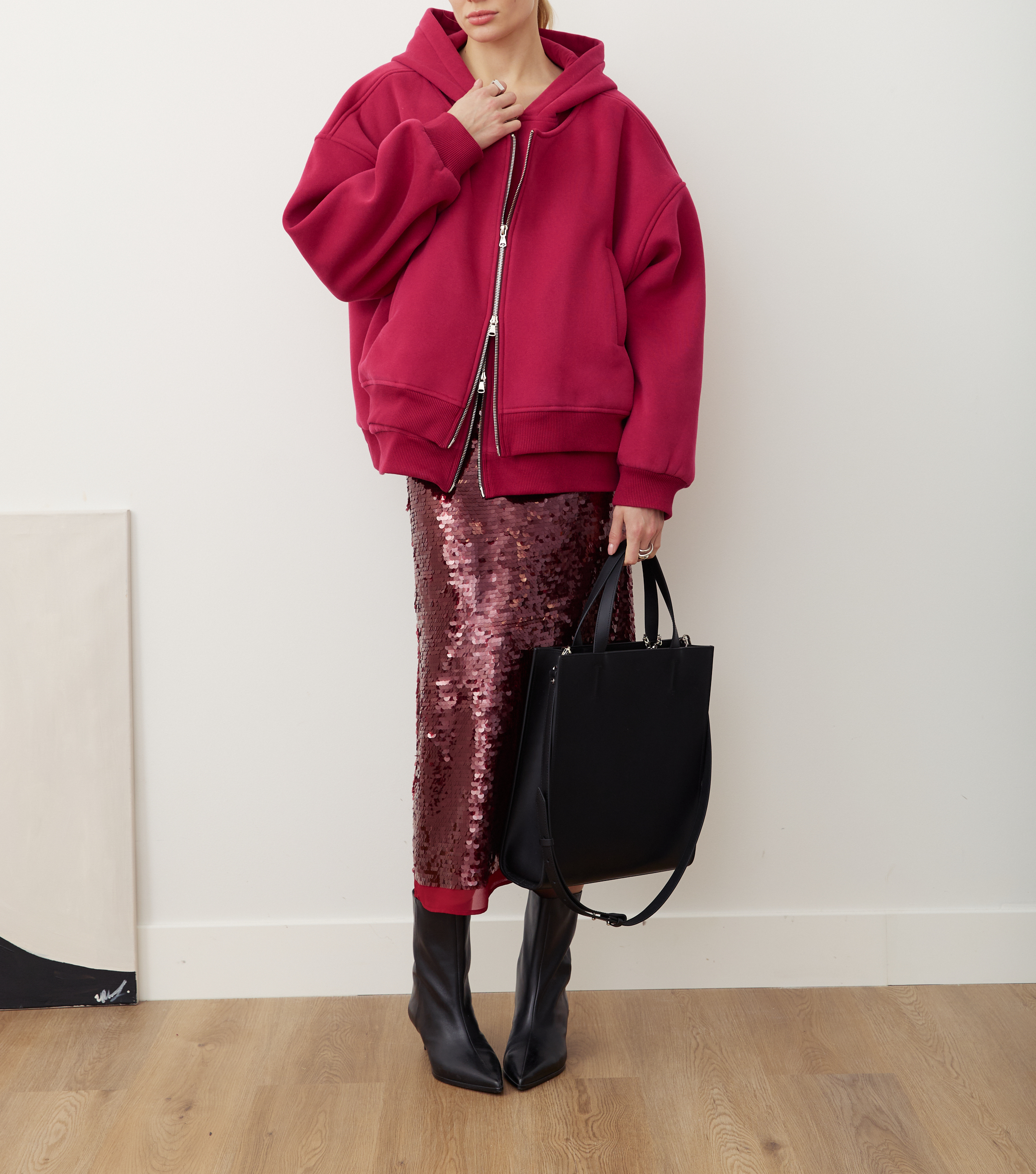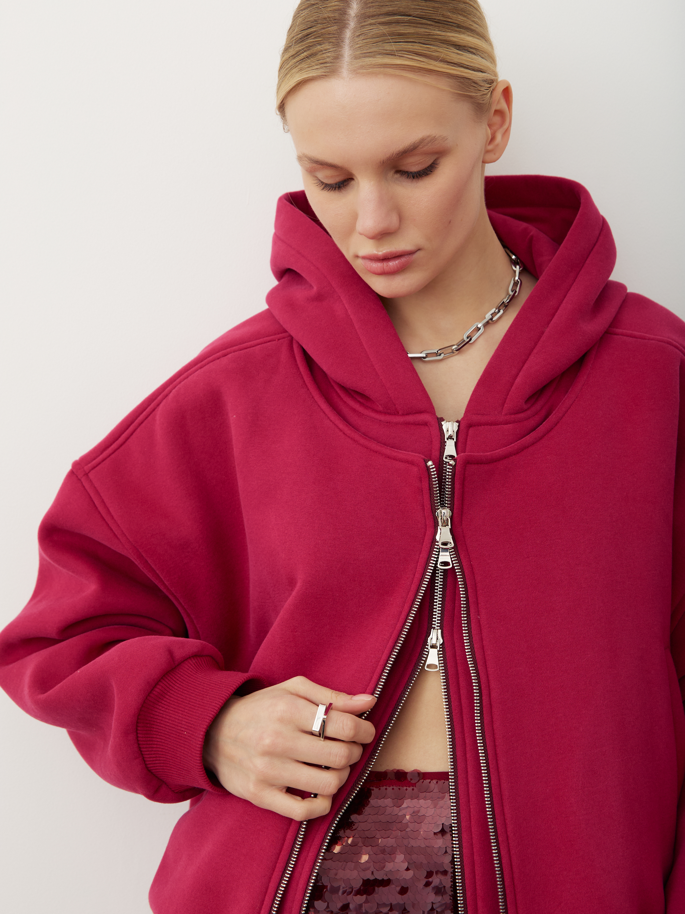 Передняя полочка куртки - двойная, а молнию можно расстегивать разными способами, создавая самые разные образы и варианты стилизации.