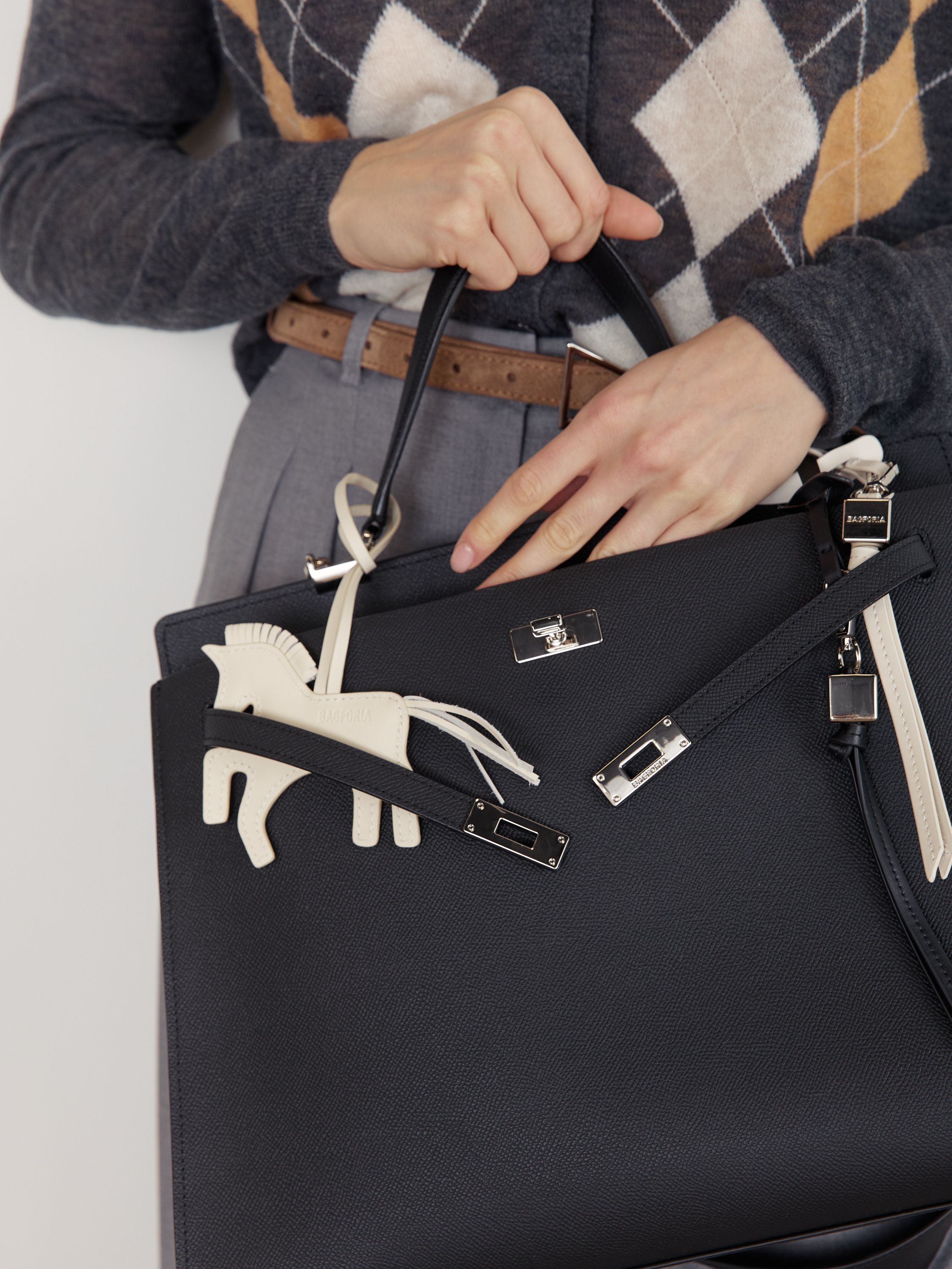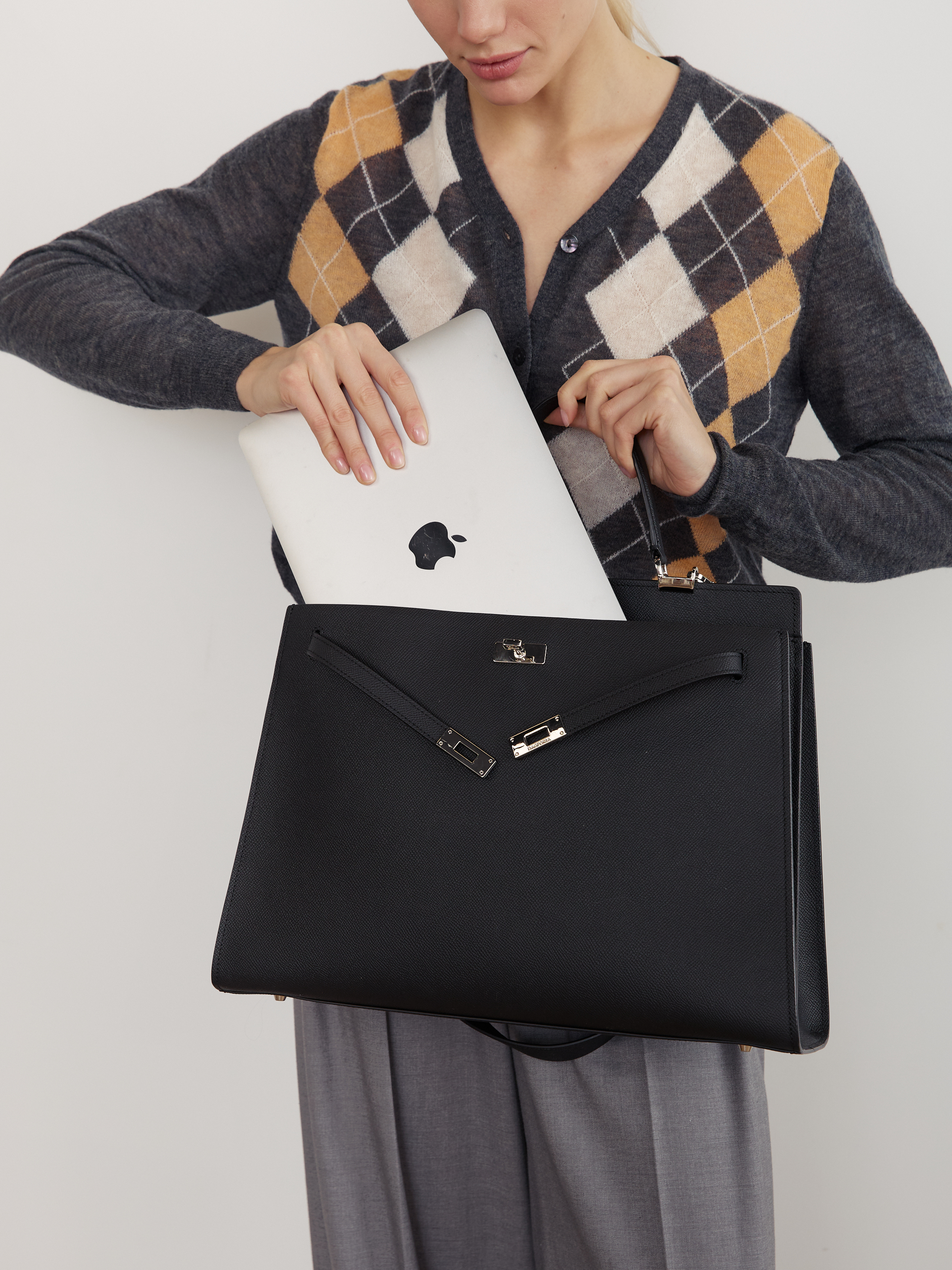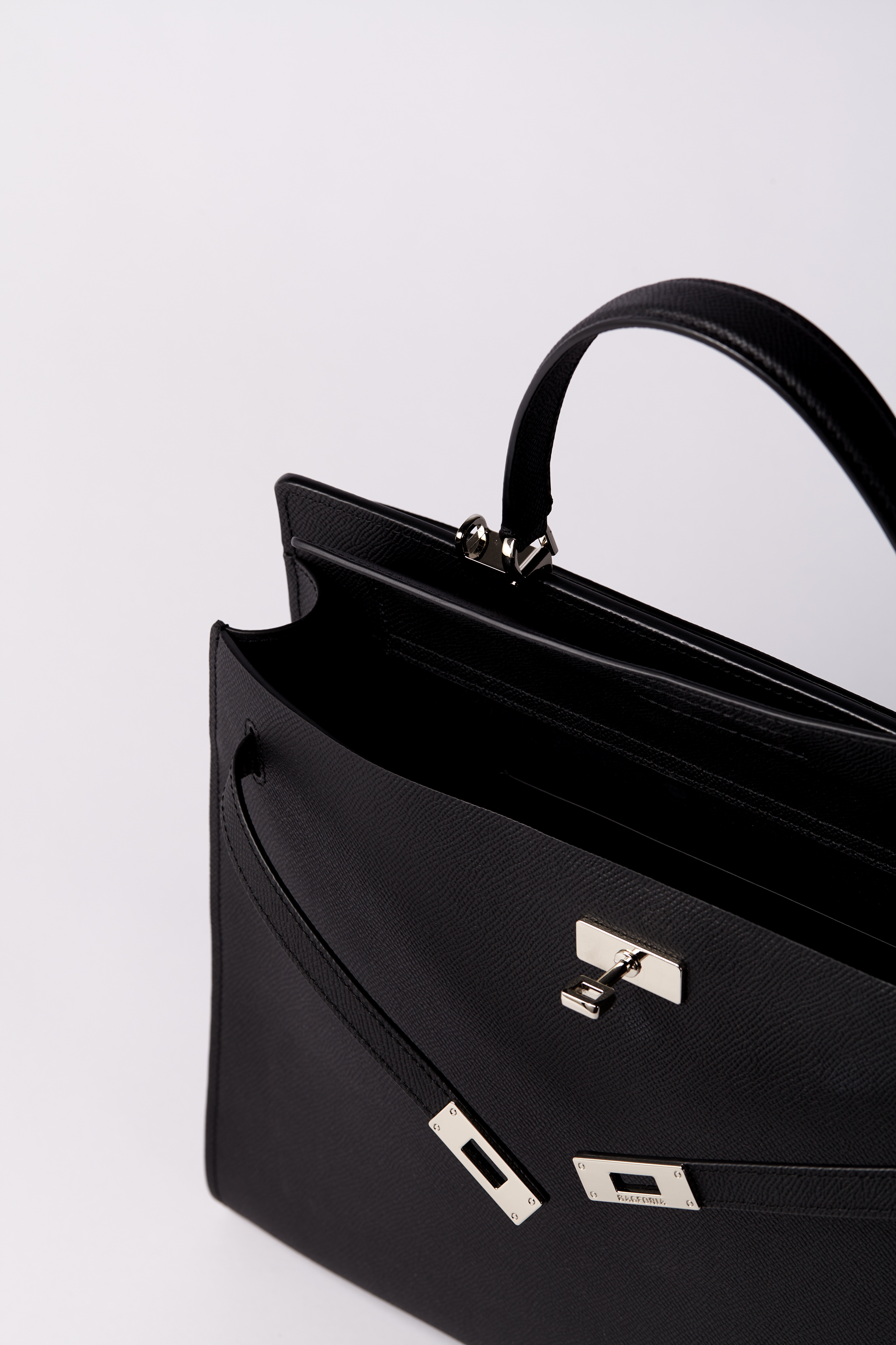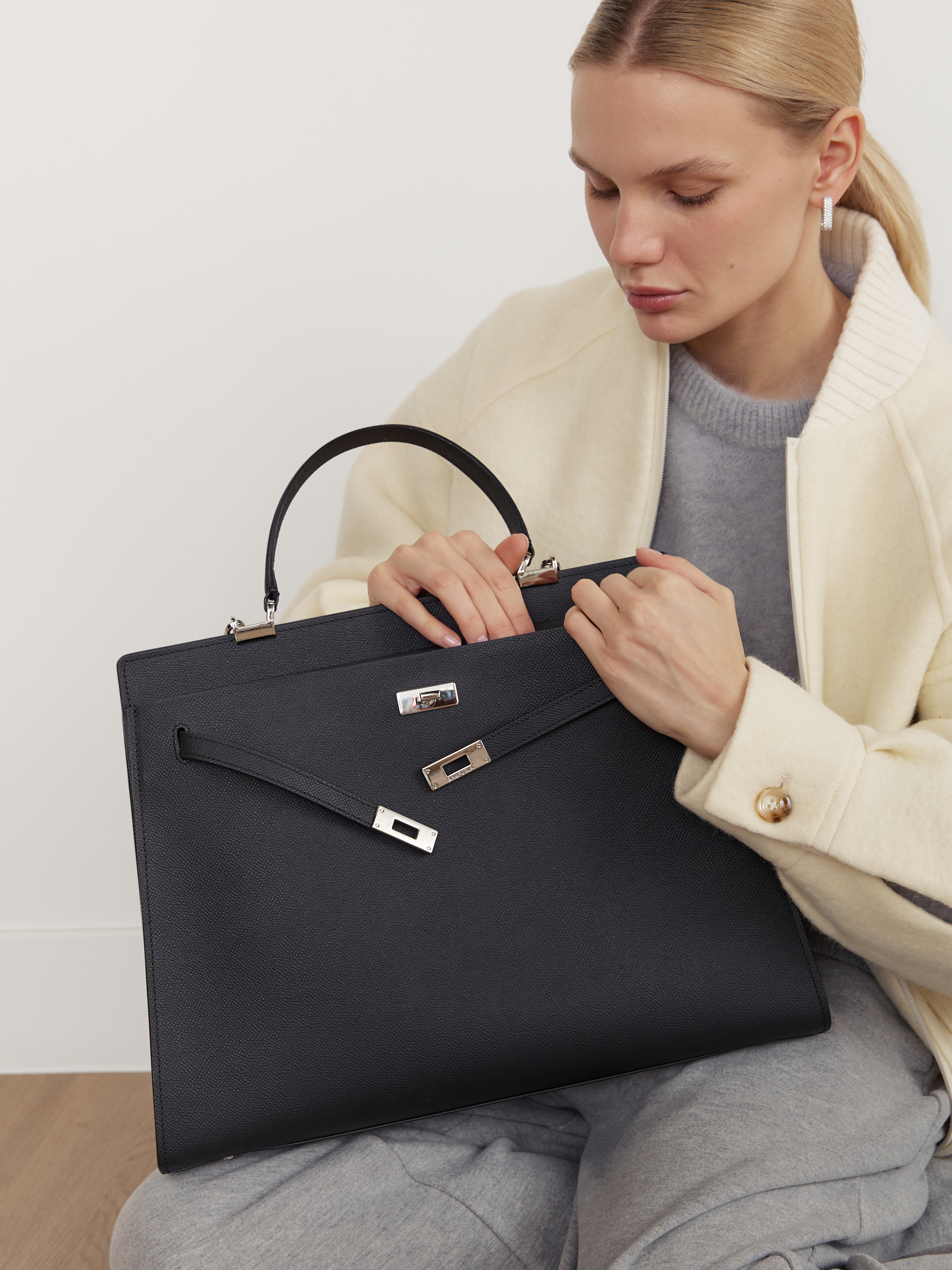 Сумка выполнена из кожи с тиснением эпсом, что делает ее поверхность устойчивой к царапинам.
