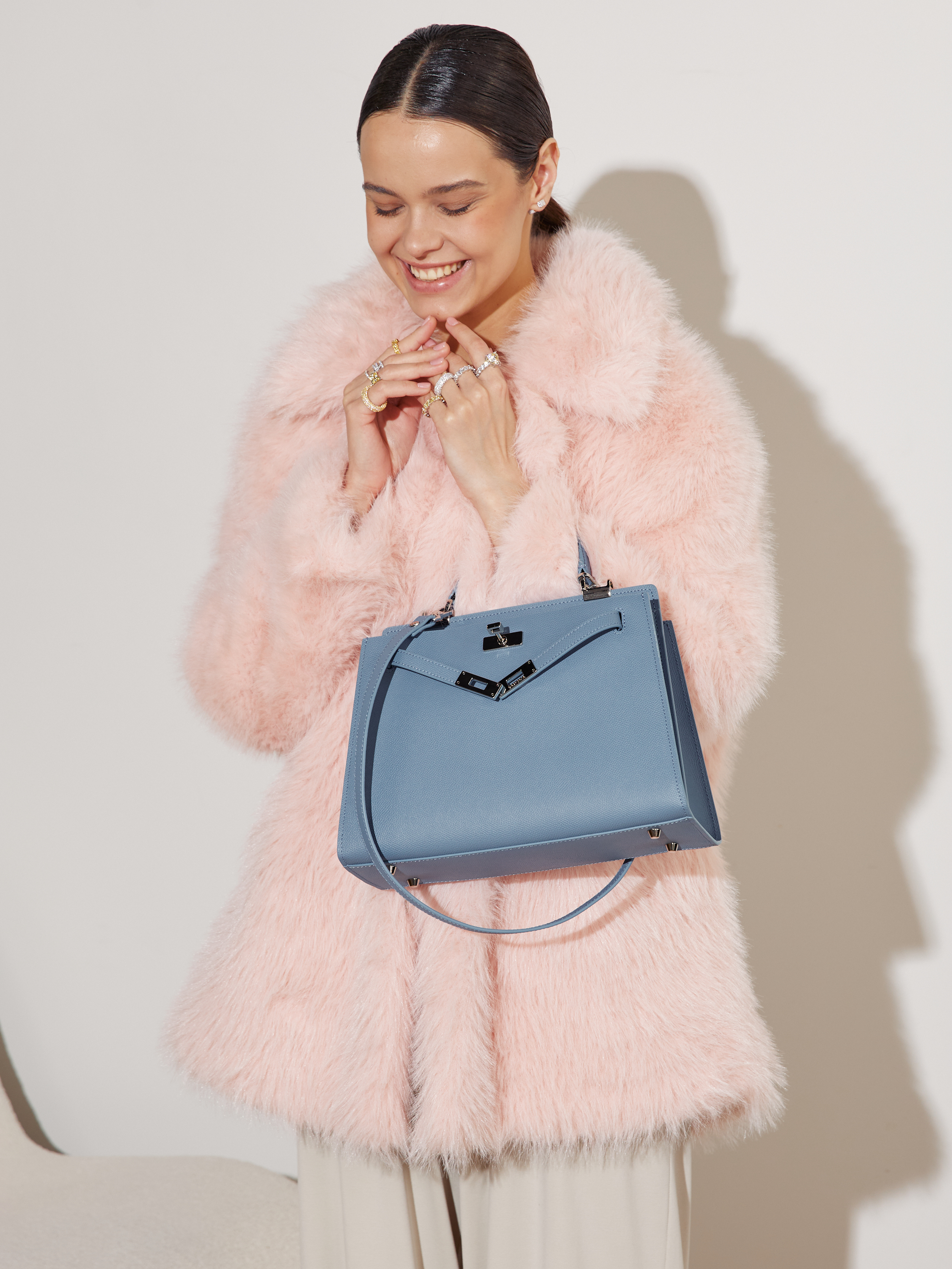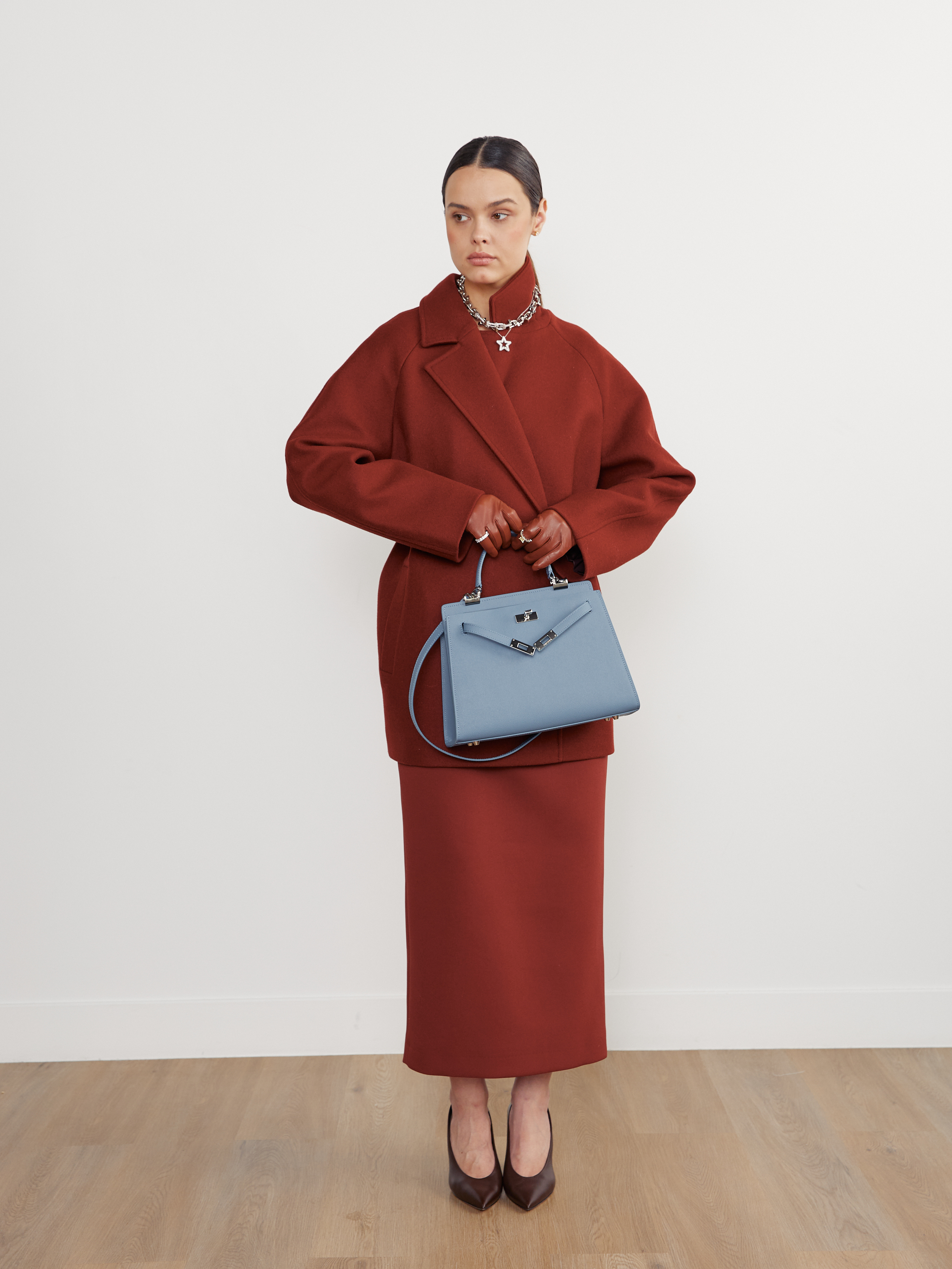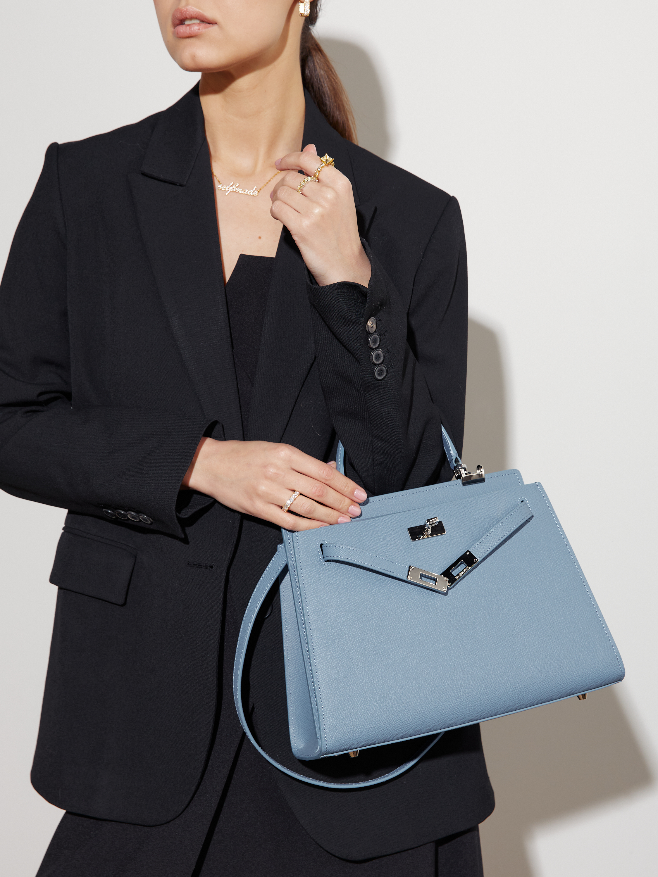Сумка выполнена из кожи с тиснением эпсом, что делает ее поверхность устойчивой к царапинам.