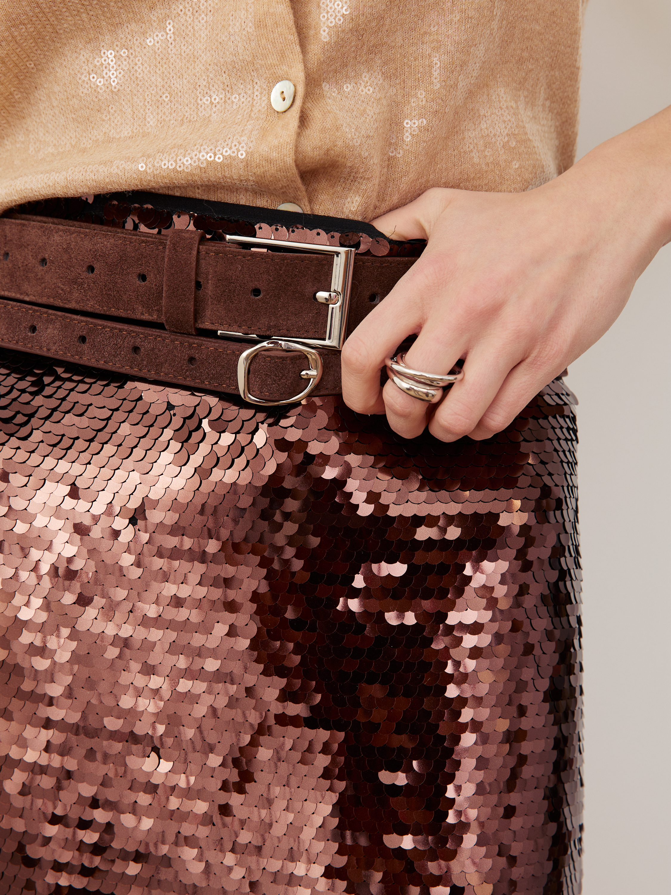Базовый тонкий ремень в два оборота из натуральной замши с минималистичной пряжкой. С обратной стороны натуральная кожа.