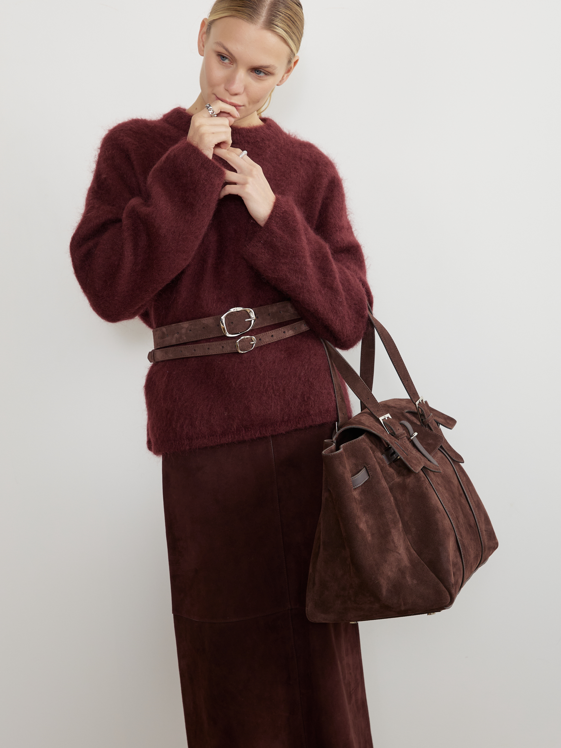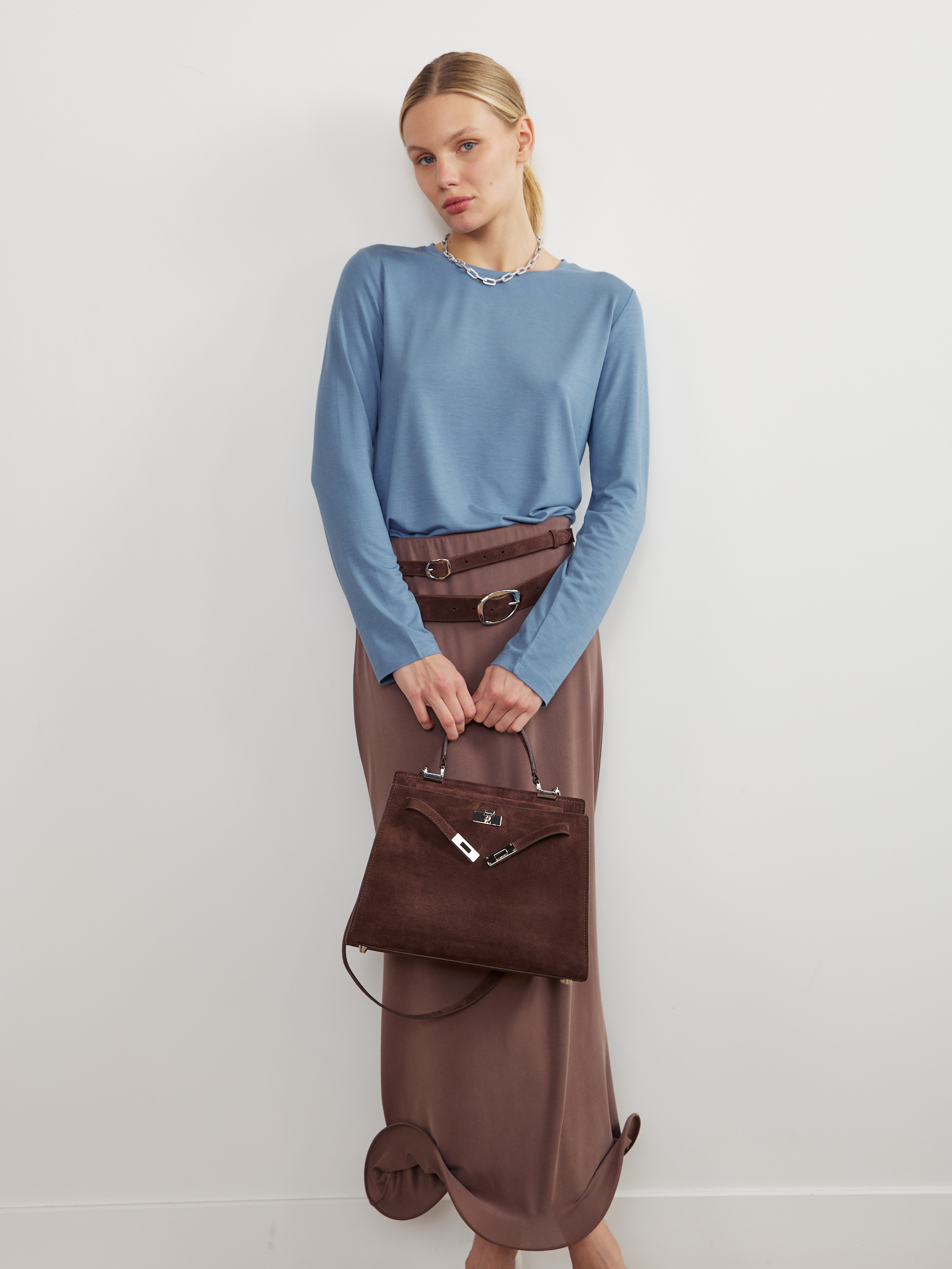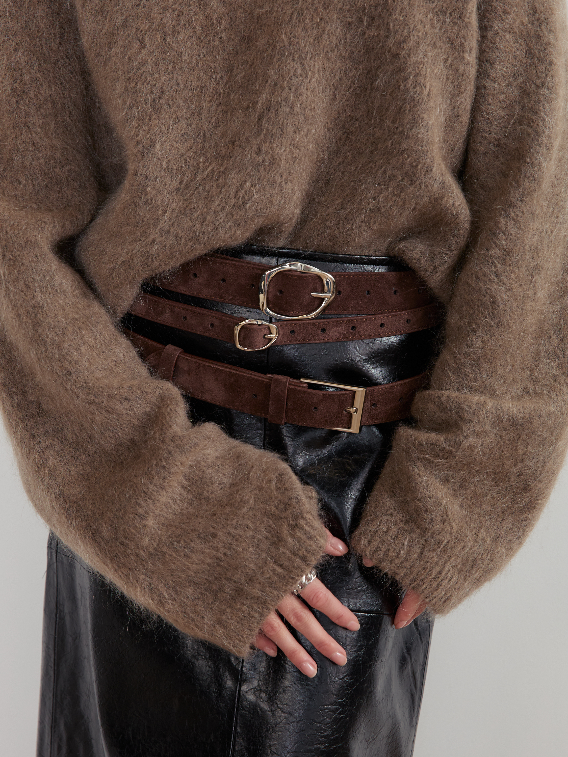 Базовый тонкий ремень в два оборота из натуральной замши с минималистичной пряжкой. С обратной стороны натуральная кожа.