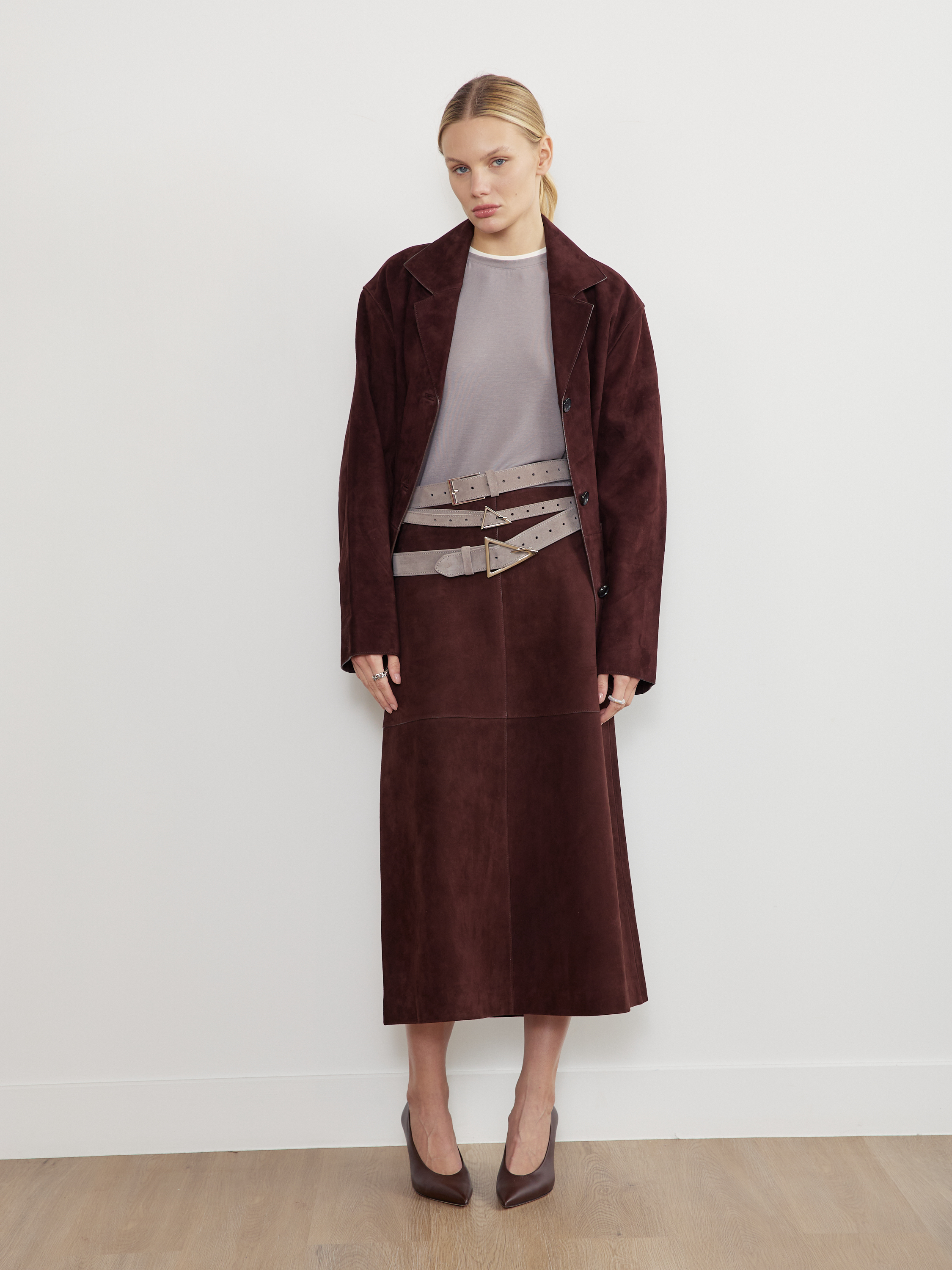 Базовый ремень в два оборота из натуральной замши с треугольной минималистичной пряжкой. С обратной стороны натуральная кожа.