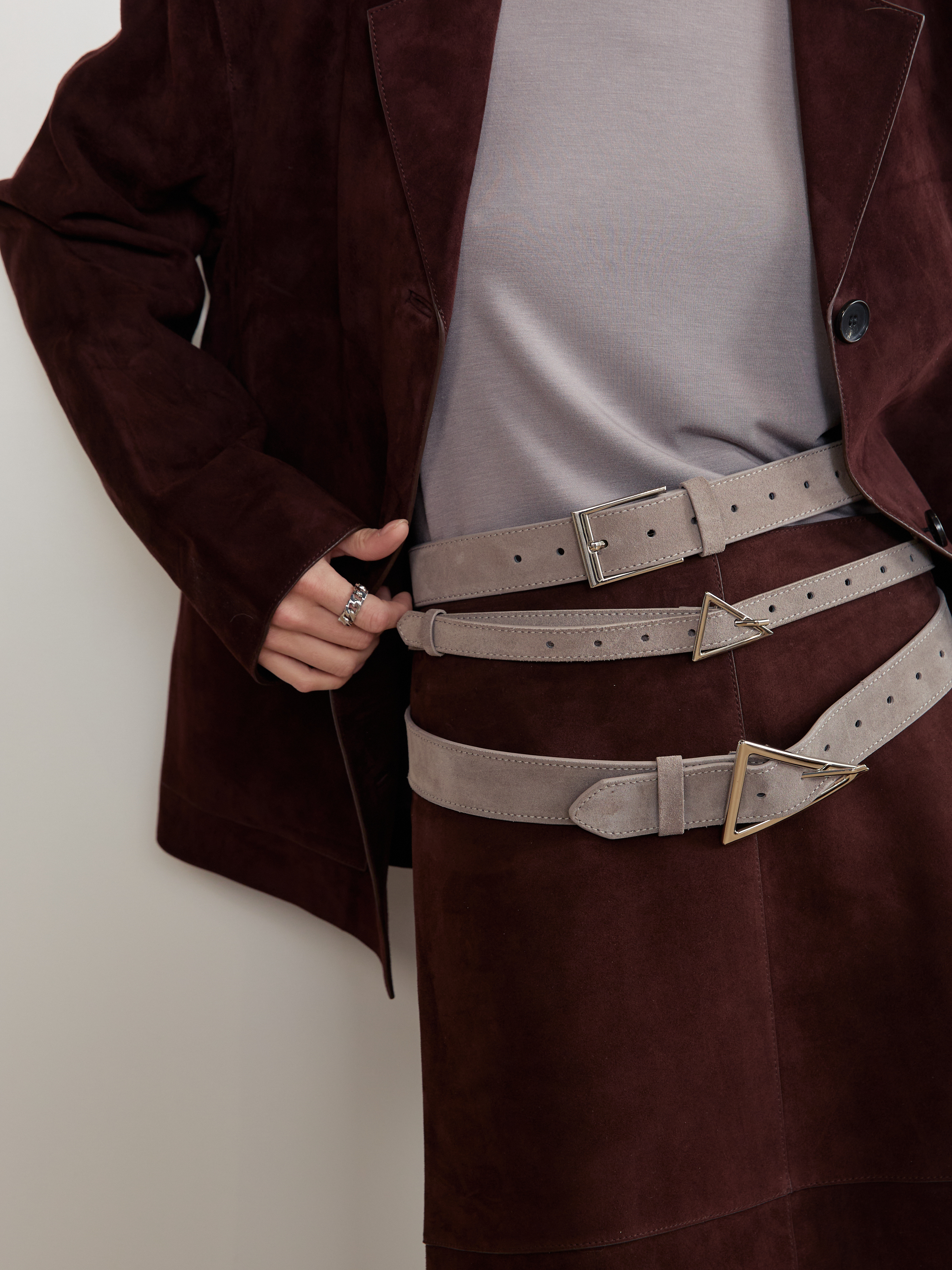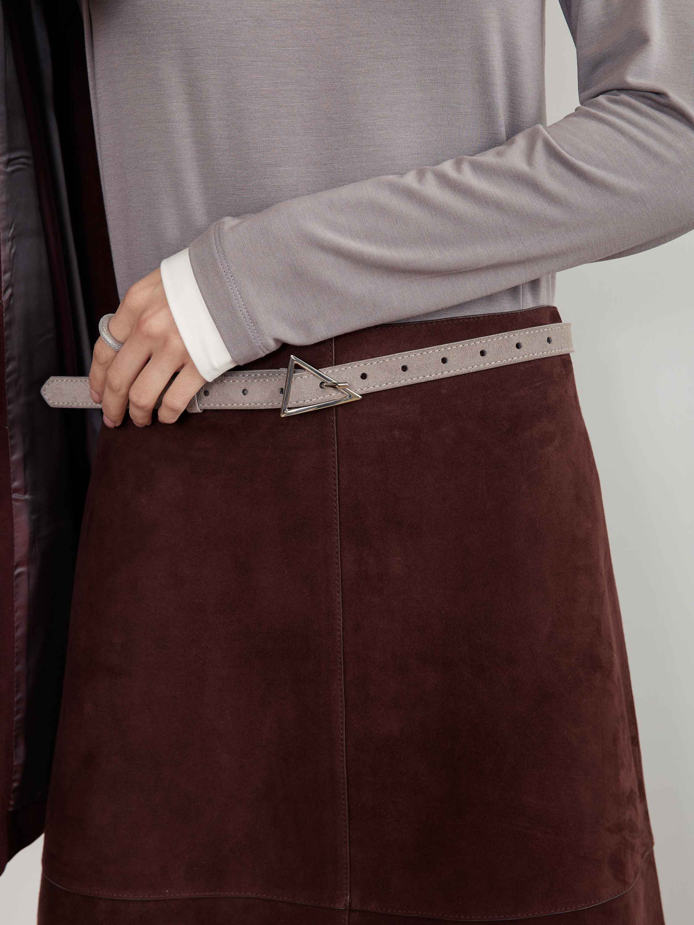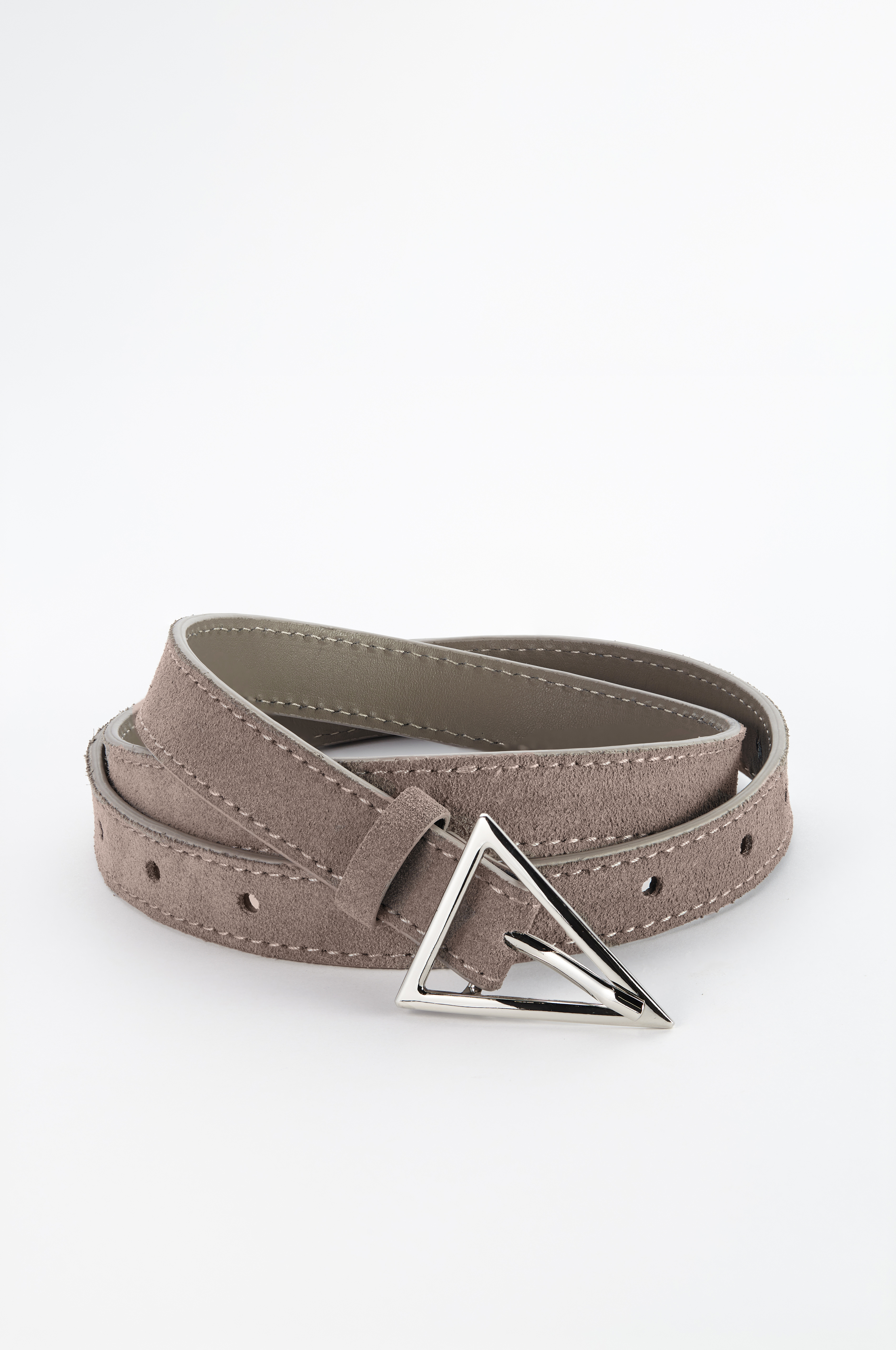 Базовый ремень в два оборота из натуральной замши с треугольной минималистичной пряжкой. С обратной стороны натуральная кожа.