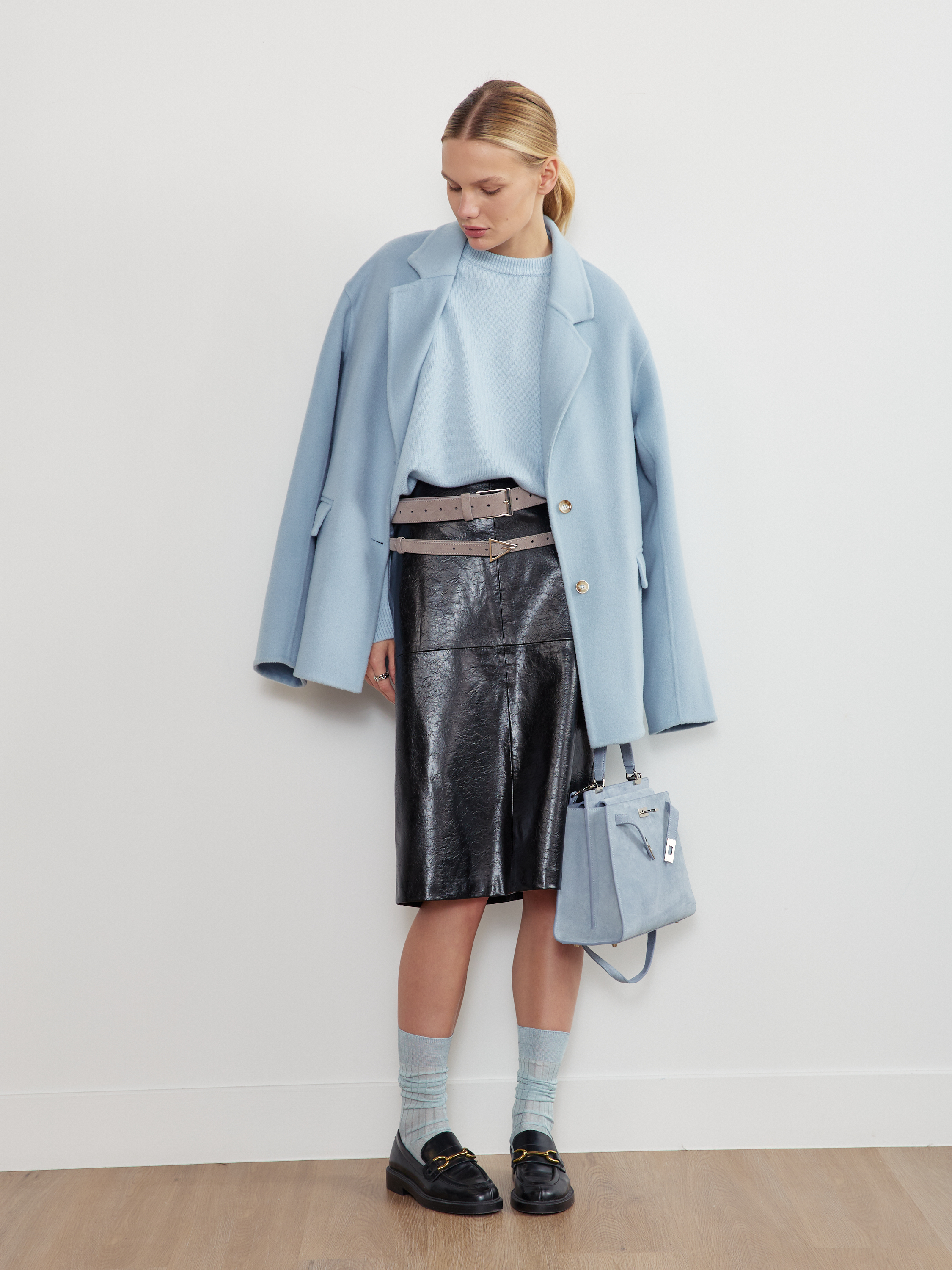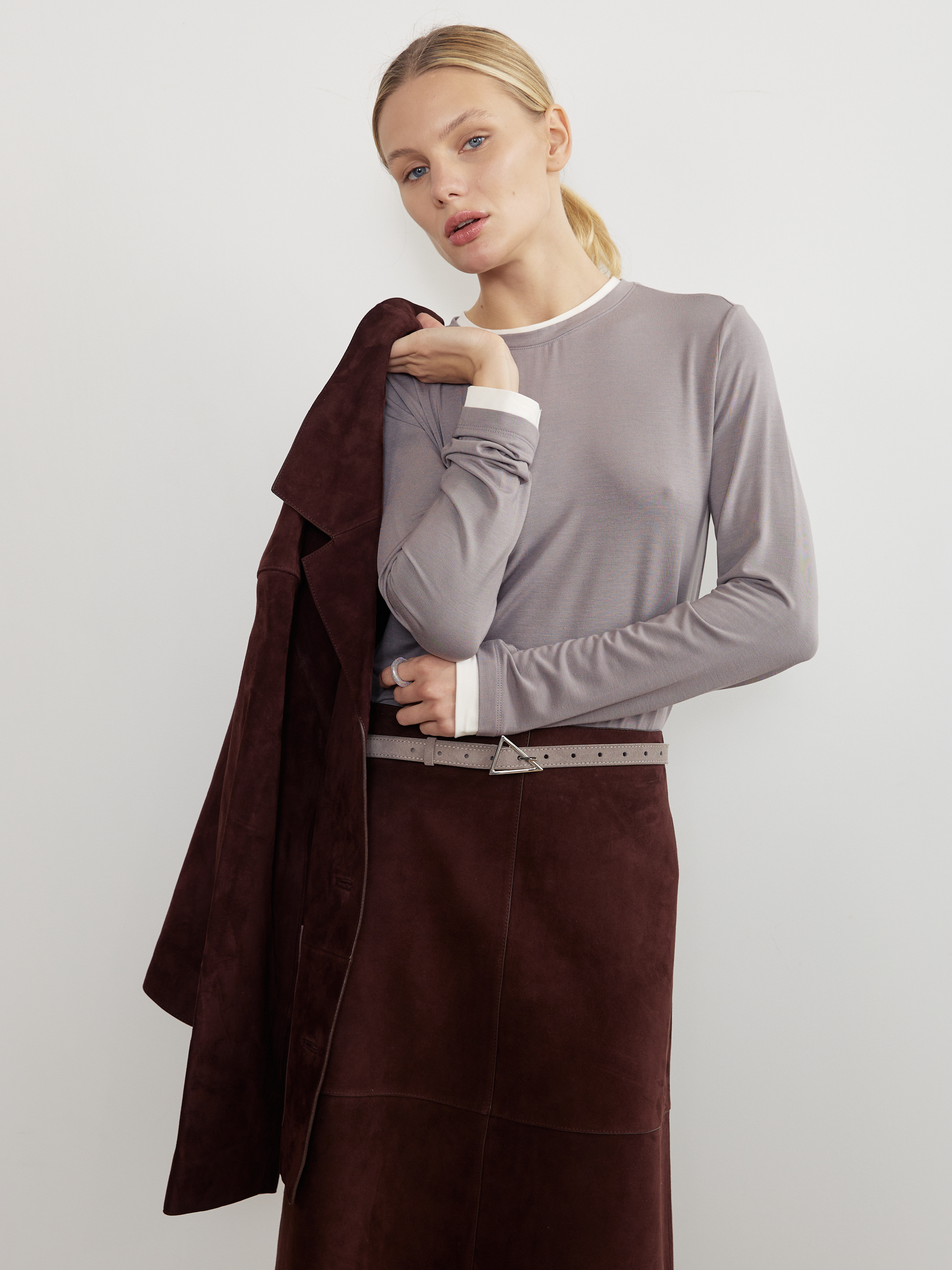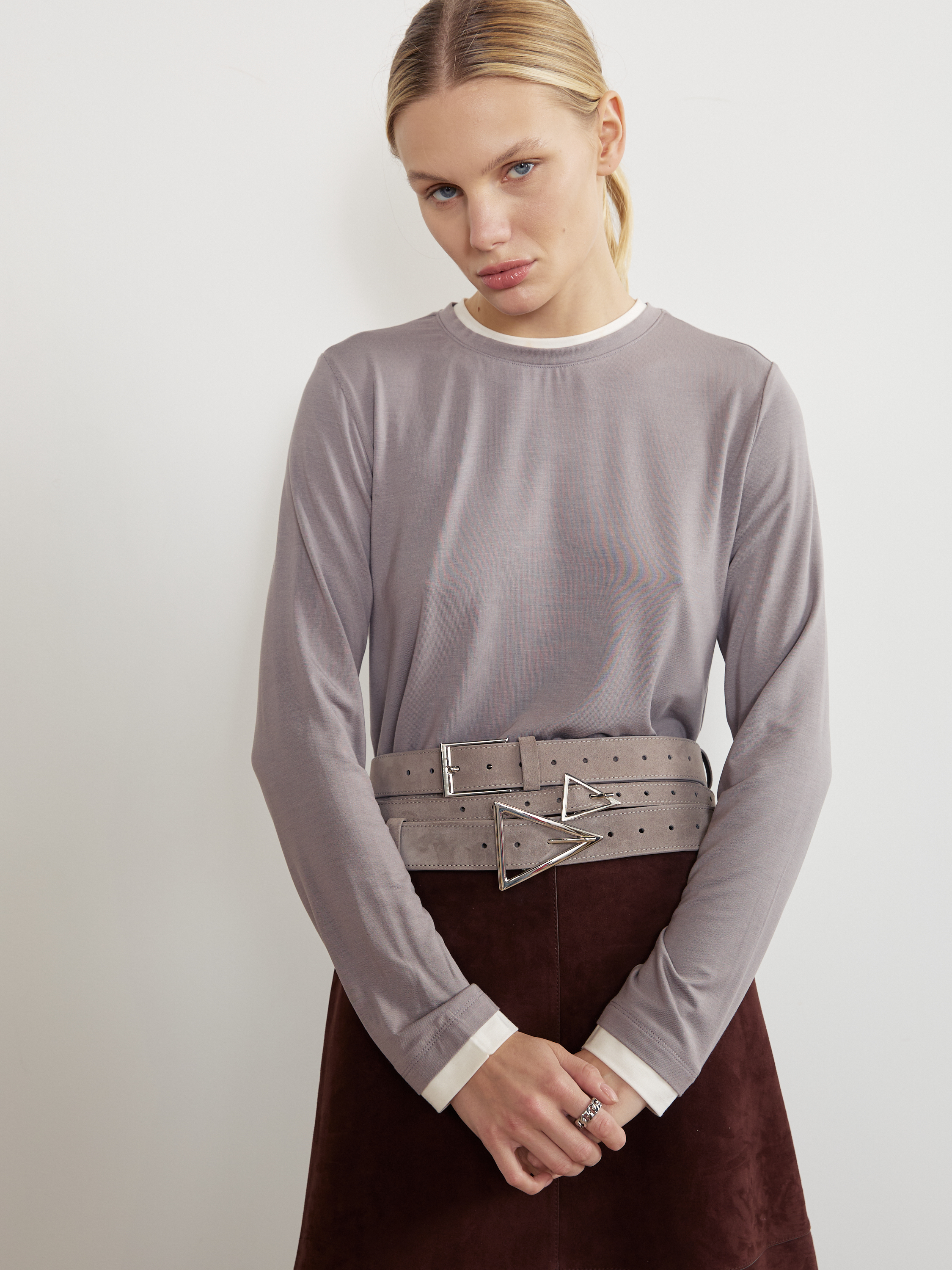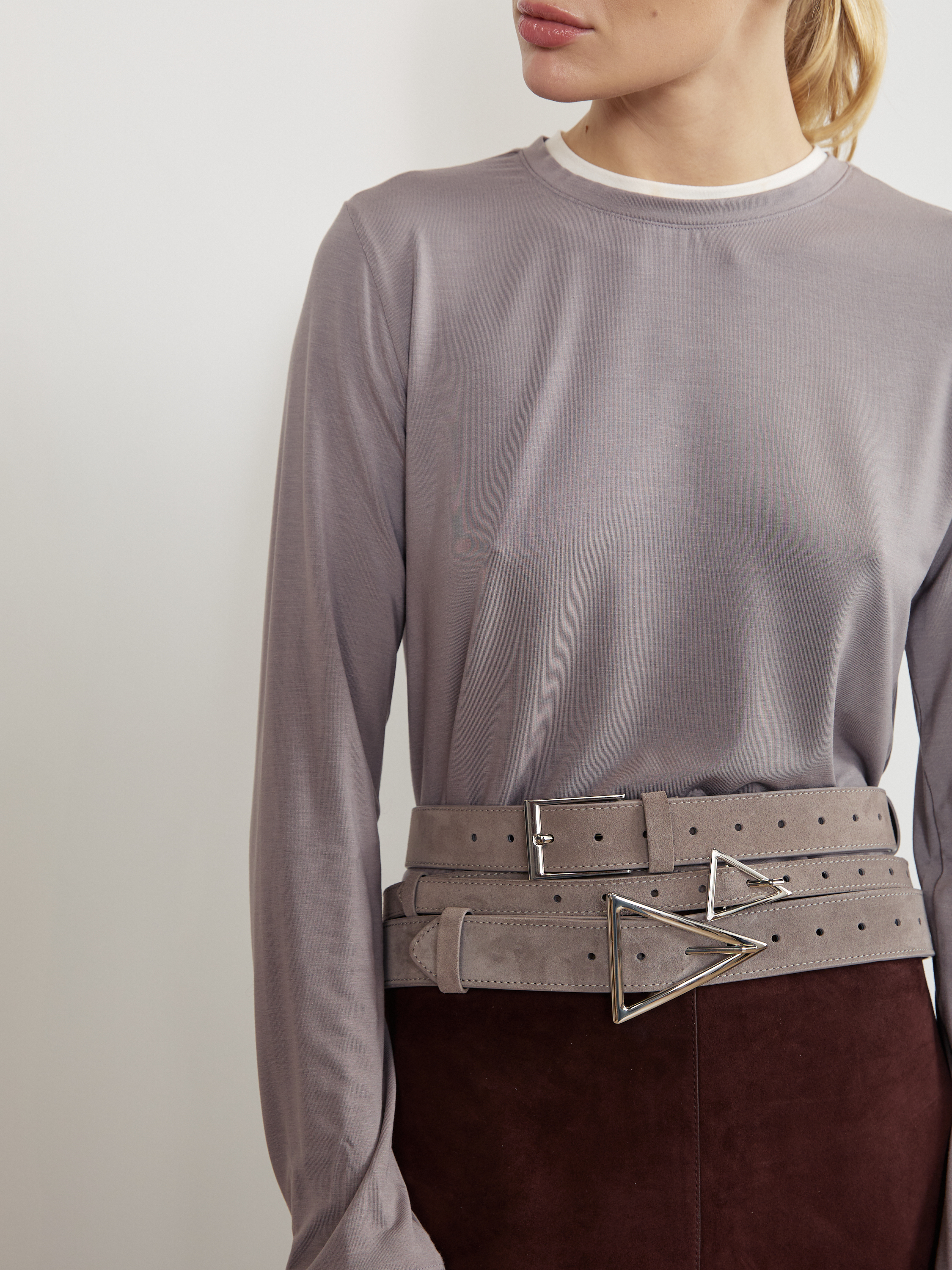 Базовый ремень в два оборота из натуральной замши с треугольной минималистичной пряжкой. С обратной стороны натуральная кожа.