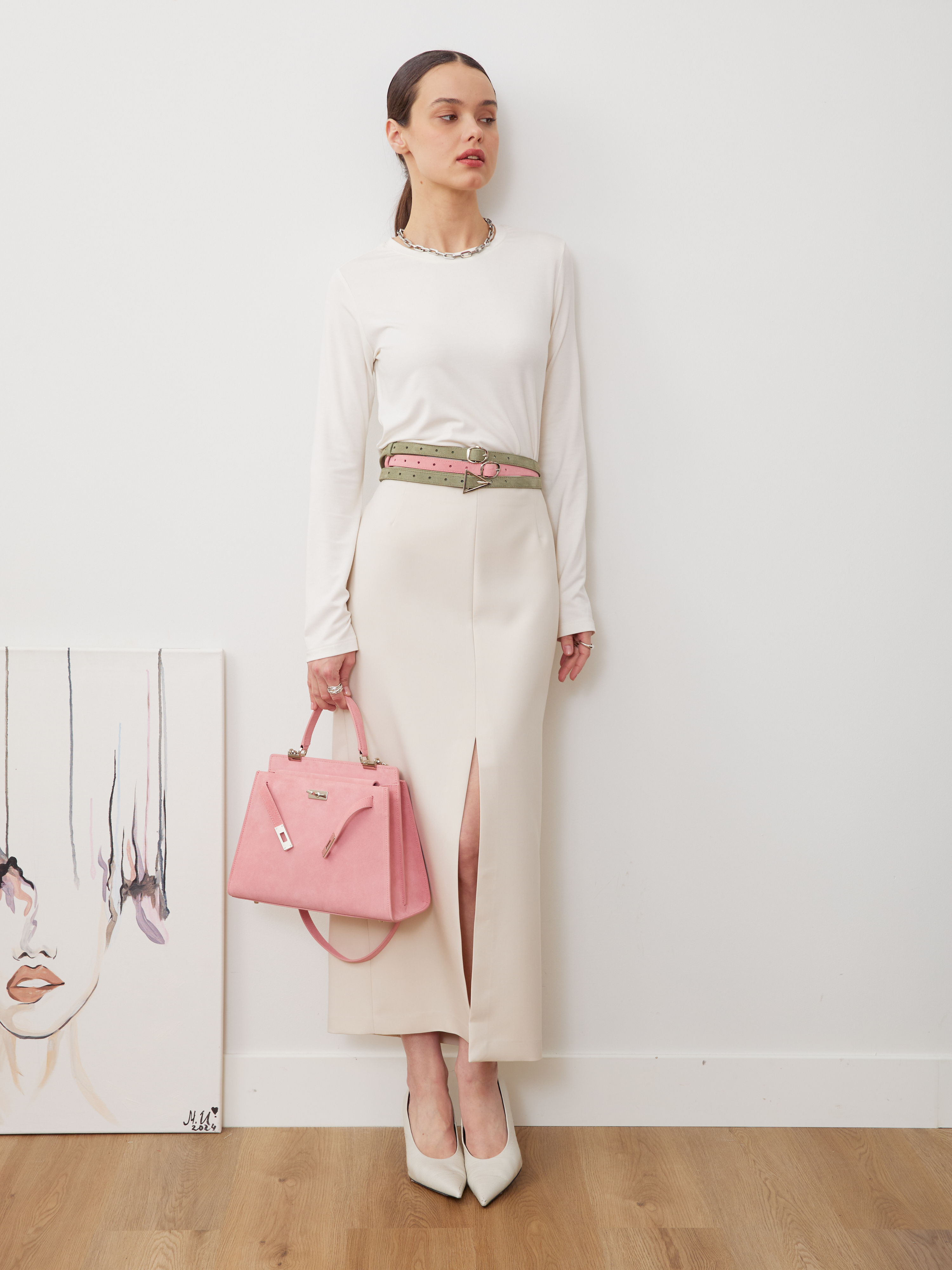 БАЗОВЫЙ ТОНКИЙ РЕМЕНЬ С ТРЕУГОЛЬНОЙ ПРЯЖКОЙ ЗАМША ФИСТАШКОВЫЙ - SRB